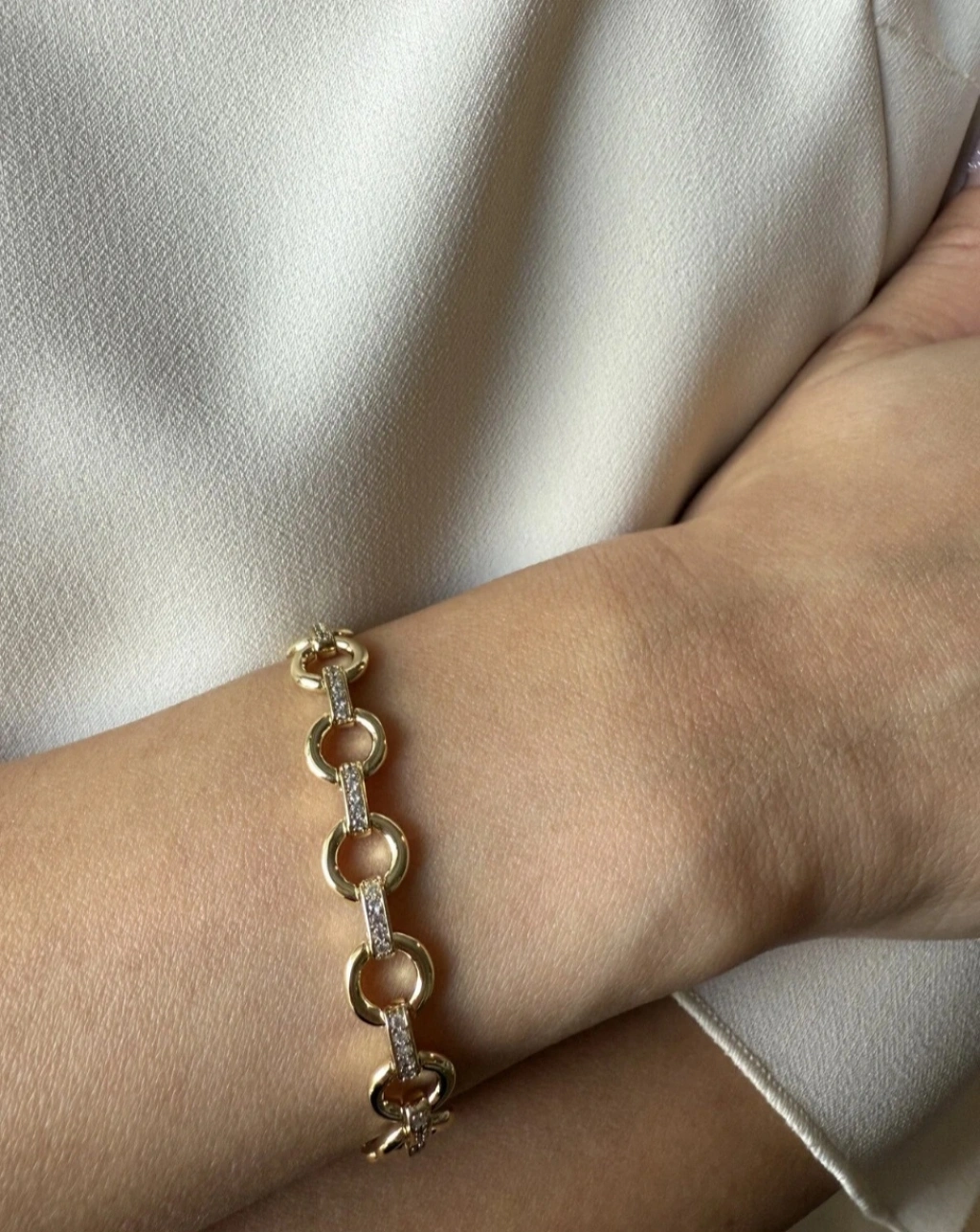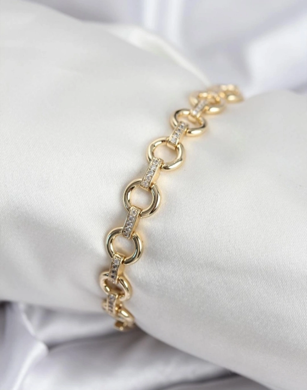 Kaliteli Xuping alaşım üzerine uygulanan 14K altın kaplama, bilekliğin uzun süre parlak ve şık görünmesini sağlar. Halka formundaki modern tasarım ile taş detaylı bağlantılar, bilekliğe hem klasik hem de modern bir karakter kazandırır. Tek başına kullanıldığında zarif bir görünüm sunarken farklı bilekliklerle kombinlendiğinde güçlü bir stil oluşturur.