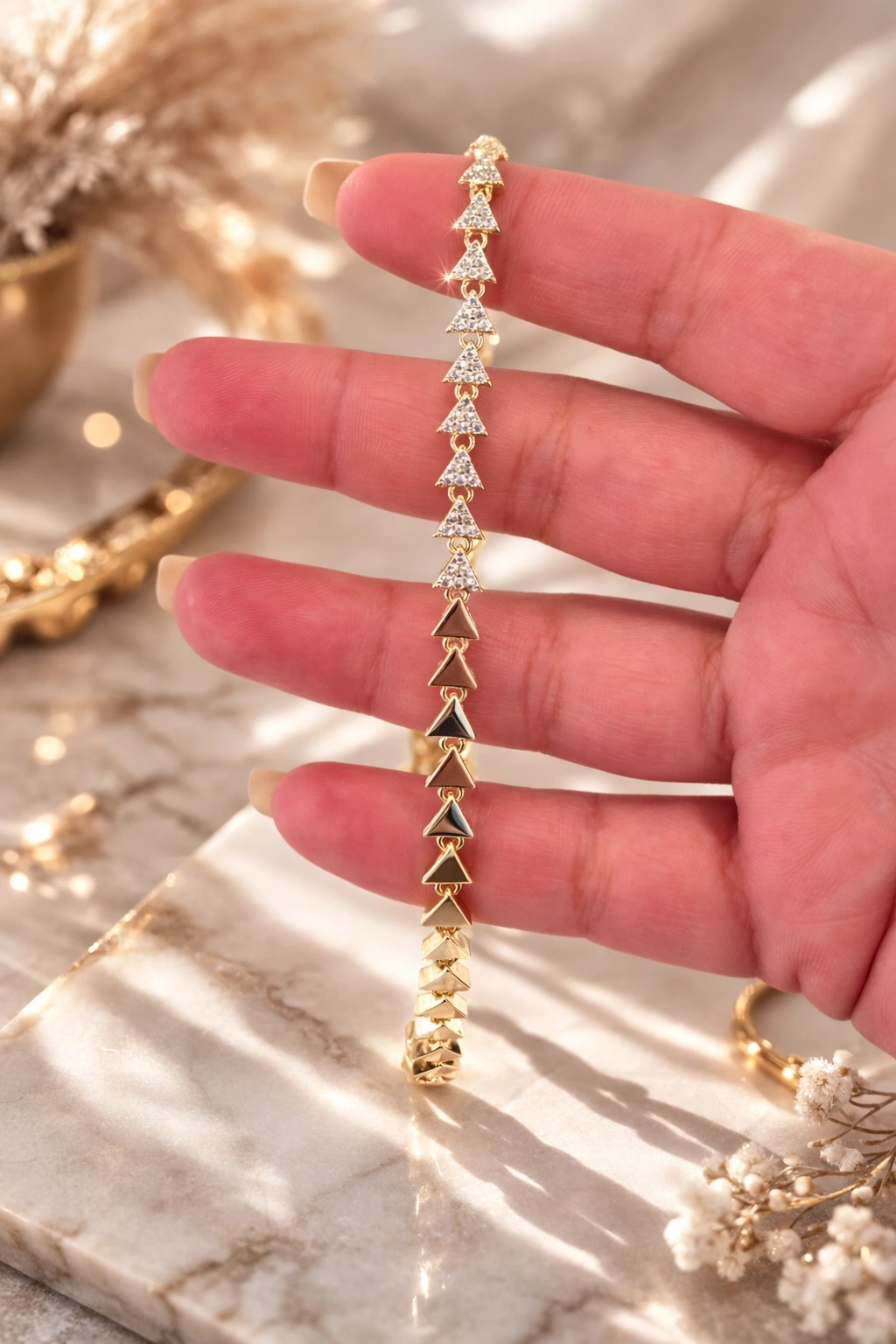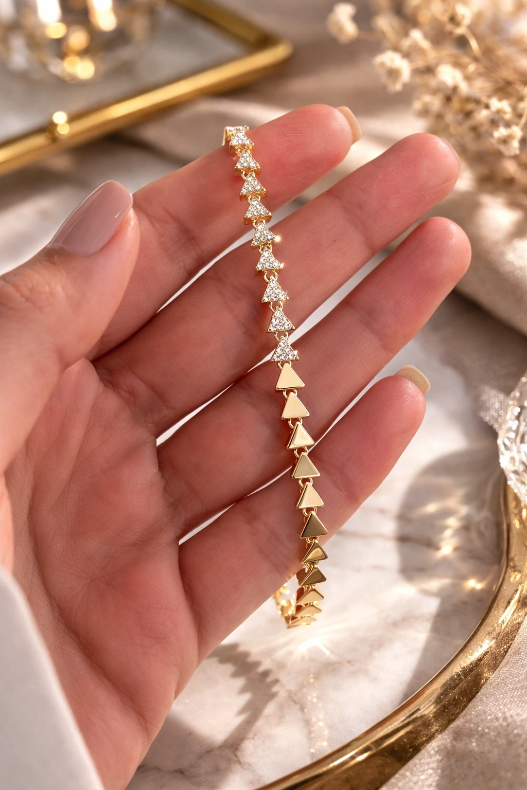 Zarif tasarımı ve ışıltılı detaylarıyla dikkat çeken 14K altın kaplama üçgen taşlı bileklik, hem kendiniz hem de sevdikleriniz için şık ve anlamlı bir hediye alternatifi sunar.