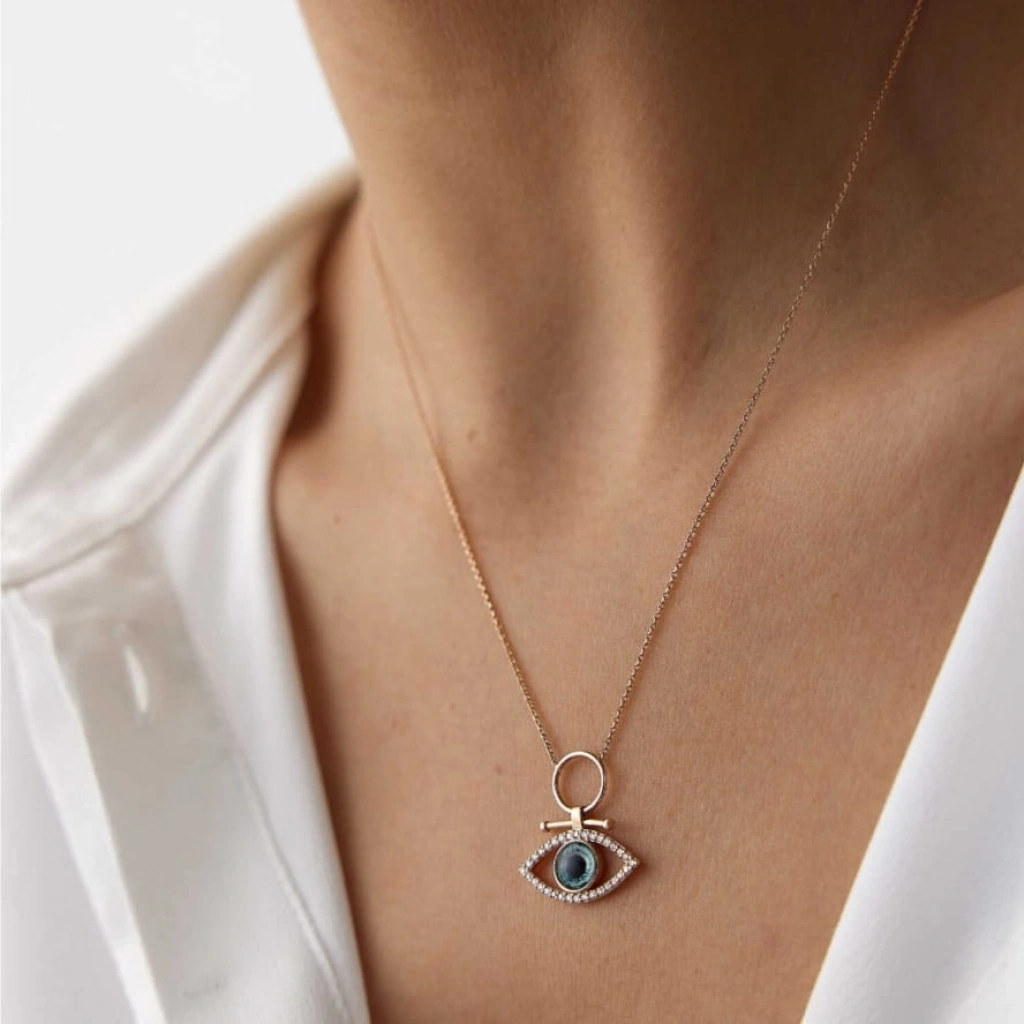 gold göz kolye, çelik gold kolye, nazar göz kolye, paslanmaz çelik kolye, taşlı göz kolye, bayan kolye, anlamlı kolye, şık kolye modeli, hediye kolye, altın renk kolye