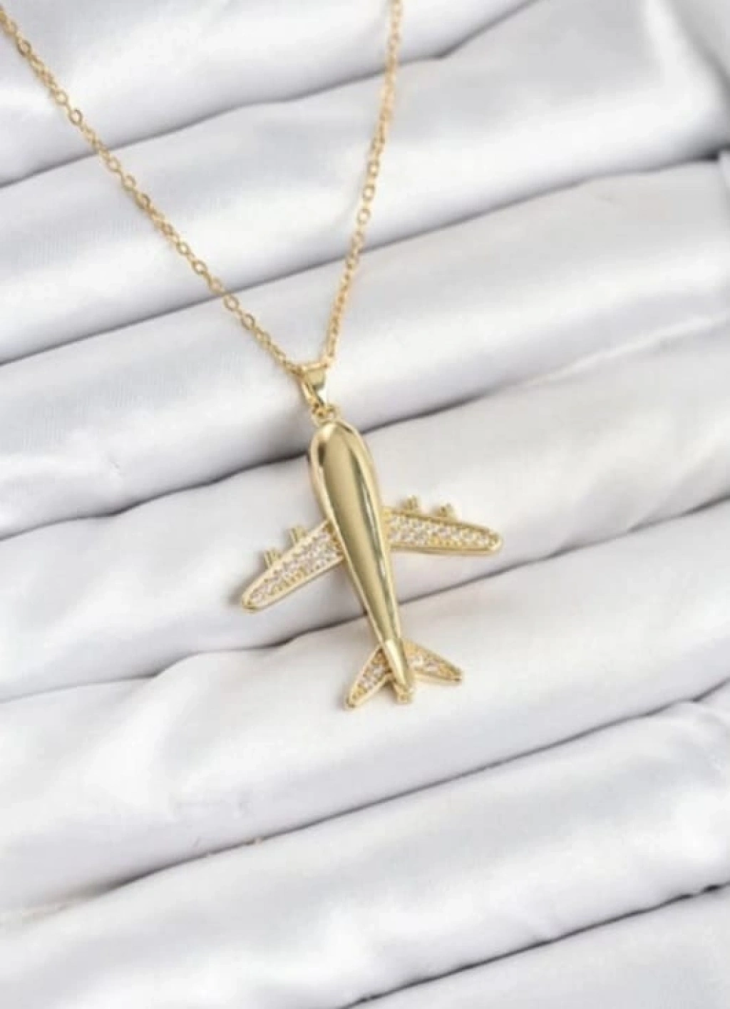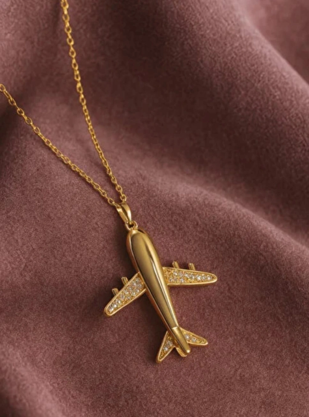 gold uçak kolye, çelik gold kolye, paslanmaz çelik kolye, seyahat temalı kolye, uçak figürlü kolye, bayan kolye, anlamlı kolye, şık kolye modeli, hediye kolye, altın renk kolye