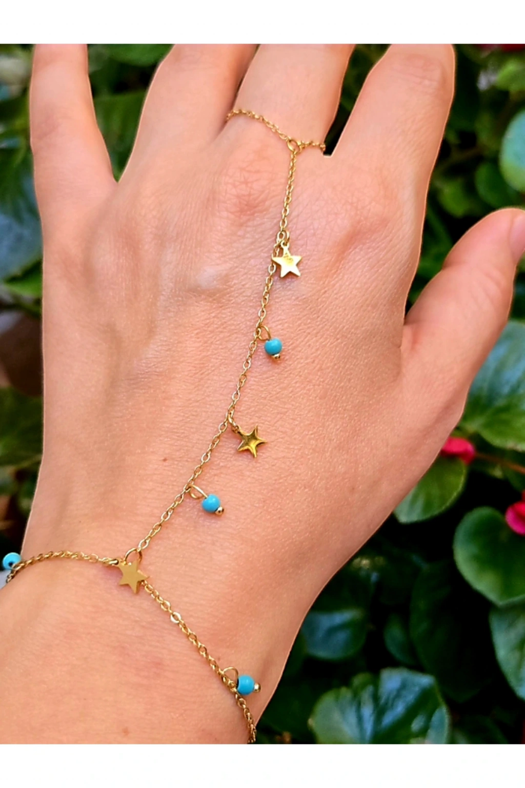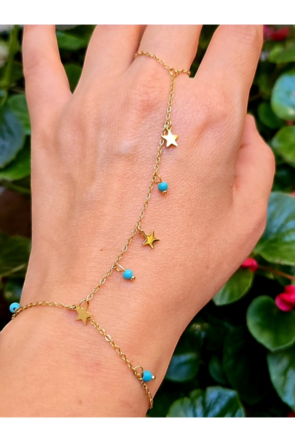 "Çelik yıldız detaylı, mavi boncuk süslemeli şahmeran, zarif ve modern tasarımıyla stilize ederek boyama katıyor.; Yüksek kaliteli paslanmaz çelikten üretilmiş olup kararma ve deformasyon yapmadan uzun ömürlü kullanım Altın renginin şıklığı, mavi boncukların enerjisi ve yıldız detayının zarafetiyle birleşerek göz alıcı bir aksesuar haline gelir.; Hafif ve ergonomik tasarımı sayesinde gün boyu yapılandırmayı kullanır, özel davetlerden günlük kombinlere her ortama kadar Ayarlanabilir yapısıyla farklı ölçülere uyum sağlar ve konforlu bir kullanım sunar.; Modern ve zarif dokusuyla hem klasik hem de bohem tarzlara uyum sağlayarak kombinlerinize sofistike bir dokunuş katar