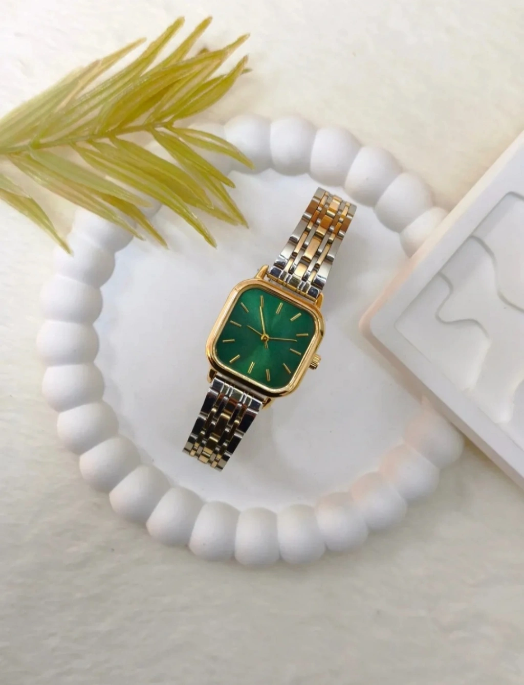 Modern ve zarif detaylarıyla öne çıkan çift renkli kadın saat, gold ve silver metal kordon uyumu ile şıklığı ve lüksü bir arada sunar. Göz alıcı yeşil kadranı ve minimal tasarımı sayesinde hem günlük kombinlerde hem de özel davetlerde stilinizi tamamlayan güçlü bir aksesuar olur.
