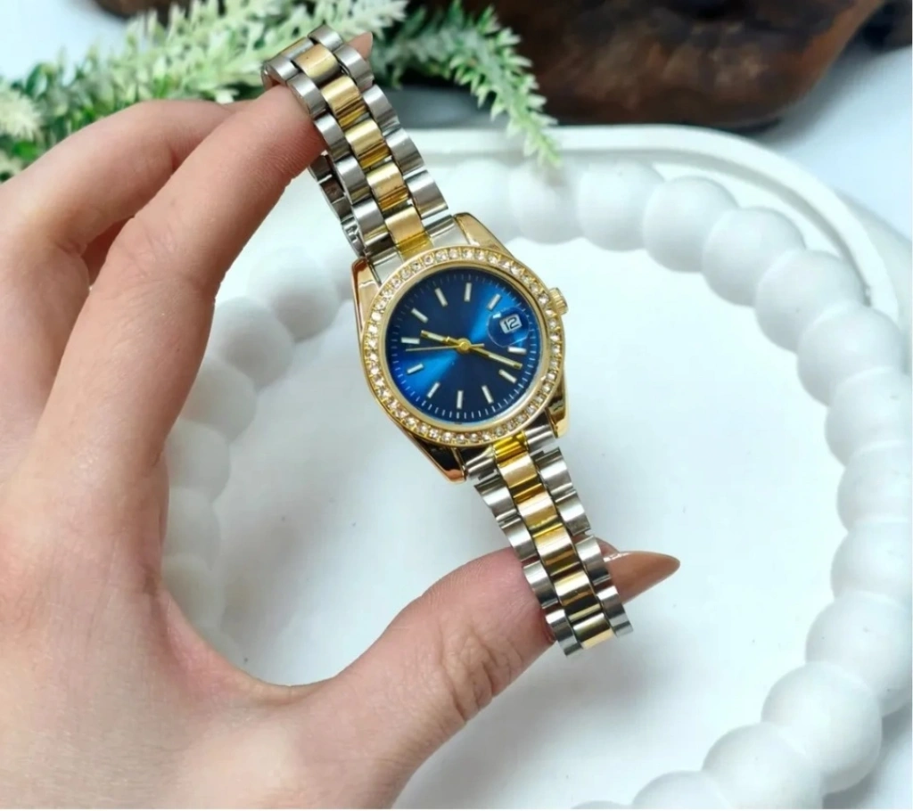 Zarif tasarımı ve şık detaylarıyla öne çıkan Gold & Gümüş Renkli Mavi Kadran Taşlı Kadın Saat, modern ve klasik stilin mükemmel birleşimini sunar. Parlak taşlarla çevrili kasa tasarımı ve göz alıcı mavi güneş ışını efektli kadranı sayesinde her kombine sofistike bir dokunuş katar.