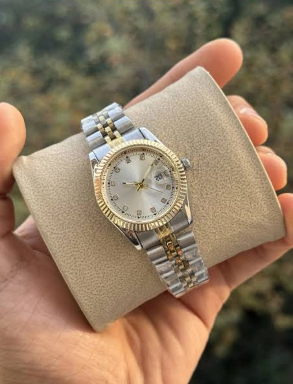 Zarif detayları ve güçlü tasarımıyla öne çıkan çift renkli taş detaylı kadın saat, gold ve silver tonlarının kusursuz uyumunu modern bir çizgide sunar. Işıltılı taş indeksleri ve gold tırtıklı çerçeve detayı sayesinde bileğinizde lüks bir etki yaratır.