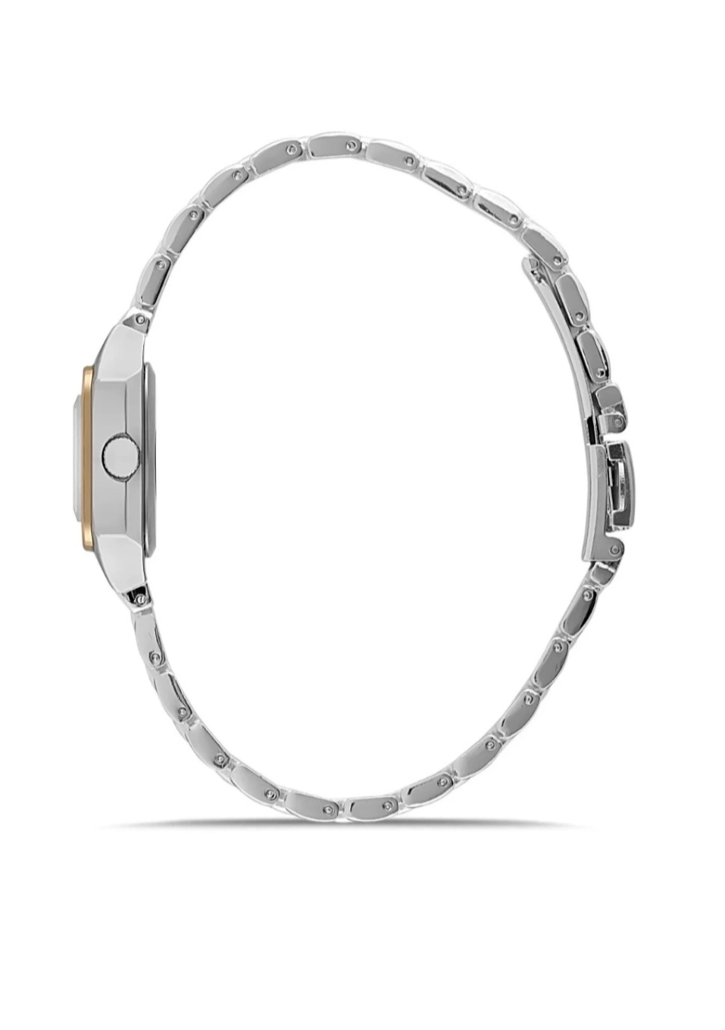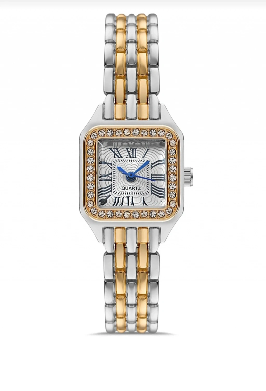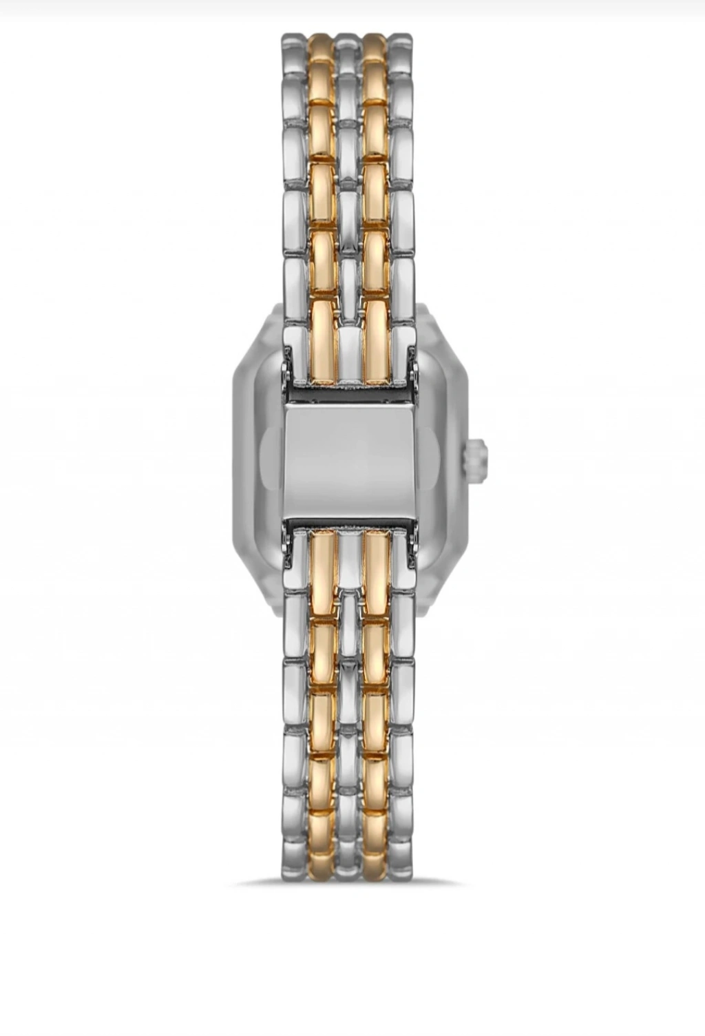 Şıklığı ve zarafeti bir arada sunan çift renkli taşlı kadın Alya saat, modern tasarımıyla göz alıcı bir görünüm sağlar. Gümüş ve gold tonlarının uyumlu kombinasyonu, bu modeli hem günlük stilinizle hem de özel davetlerle mükemmel şekilde tamamlar. Kare kasa formu ve çerçevesini çevreleyen parlak taş detayları, saate premium ve dikkat çekici bir hava kazandırır.