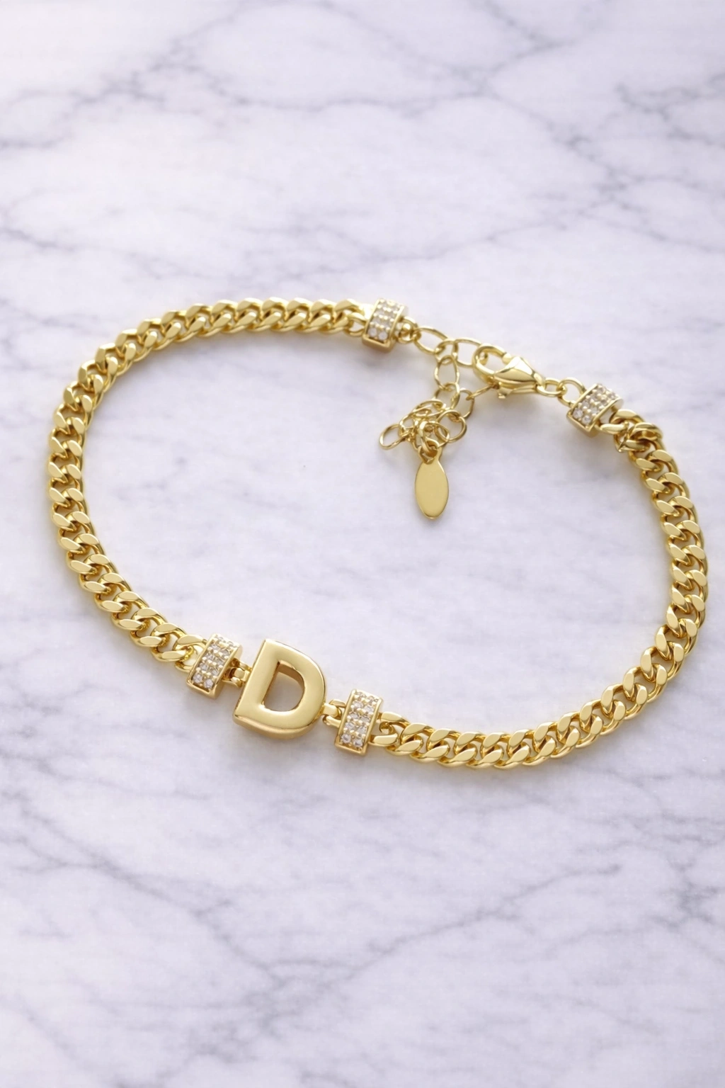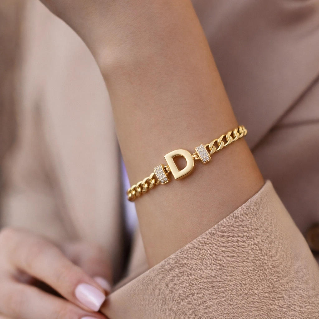 D Harfli Zincir Bileklik – 14K Altın Kaplama, Taş Detaylı Şık Tasarım