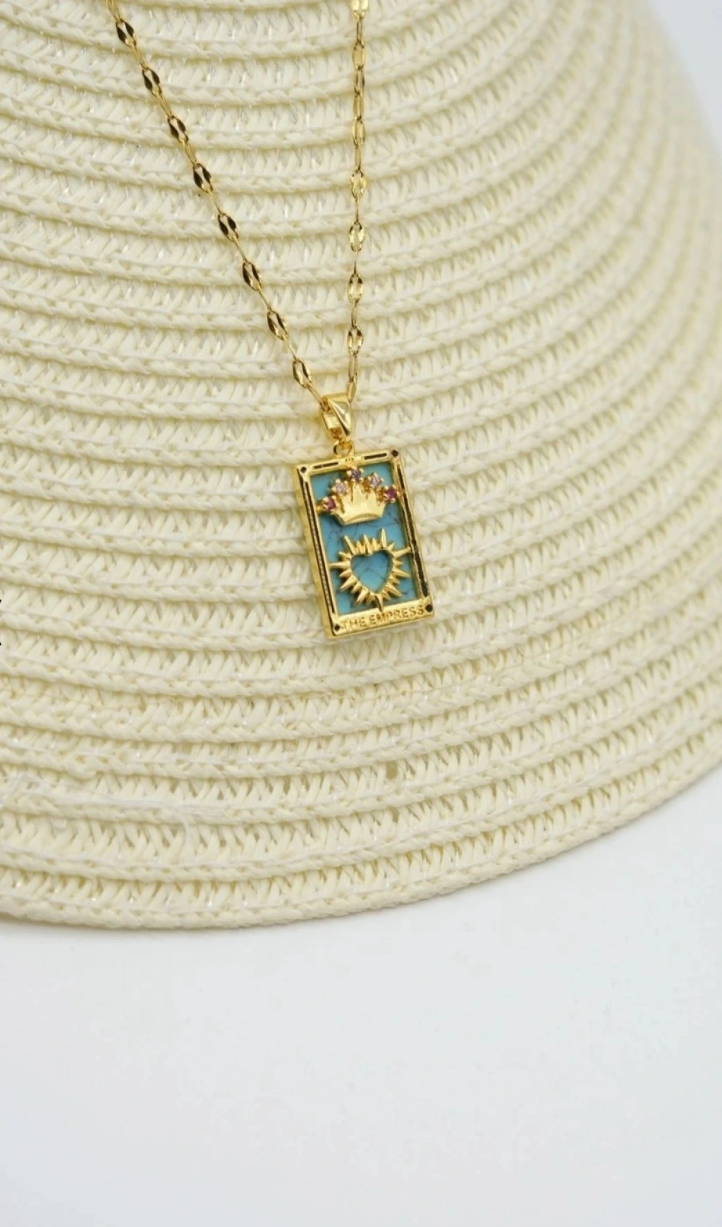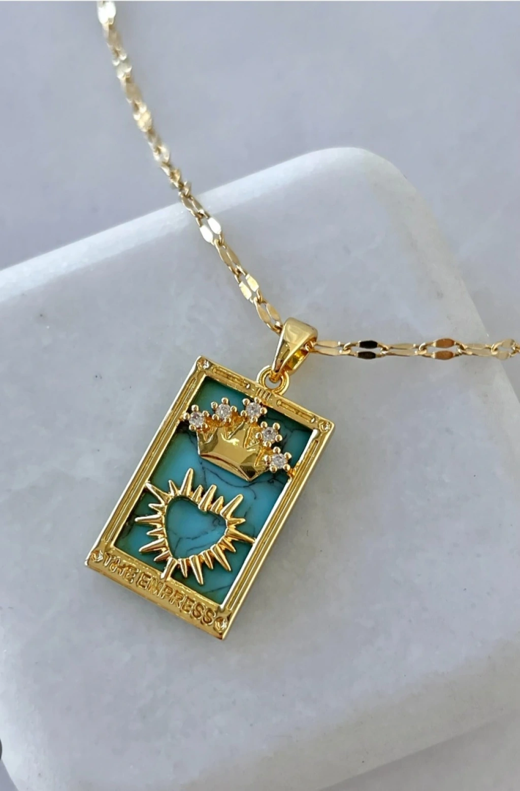 Dikdörtgen formdaki özel tasarım ucunda; üst kısımda taş detaylı kraliyet tacı, alt bölümde ise ışıltılı kalp & güneş sembolü yer alır. Soft mavi mine zemin üzerindeki bu detaylar kolyeye hem mistik hem de lüks bir hava katar. Alt bölümde “THE EMPRESS” yazısı ile tarotun ilahi dişil enerjisi tamamlanmıştır.