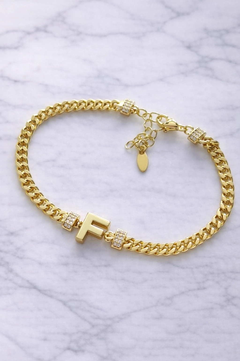 F Harfli Zincir Bileklik – 14K Altın Kaplama, Taş Detaylı Şık Tasarım