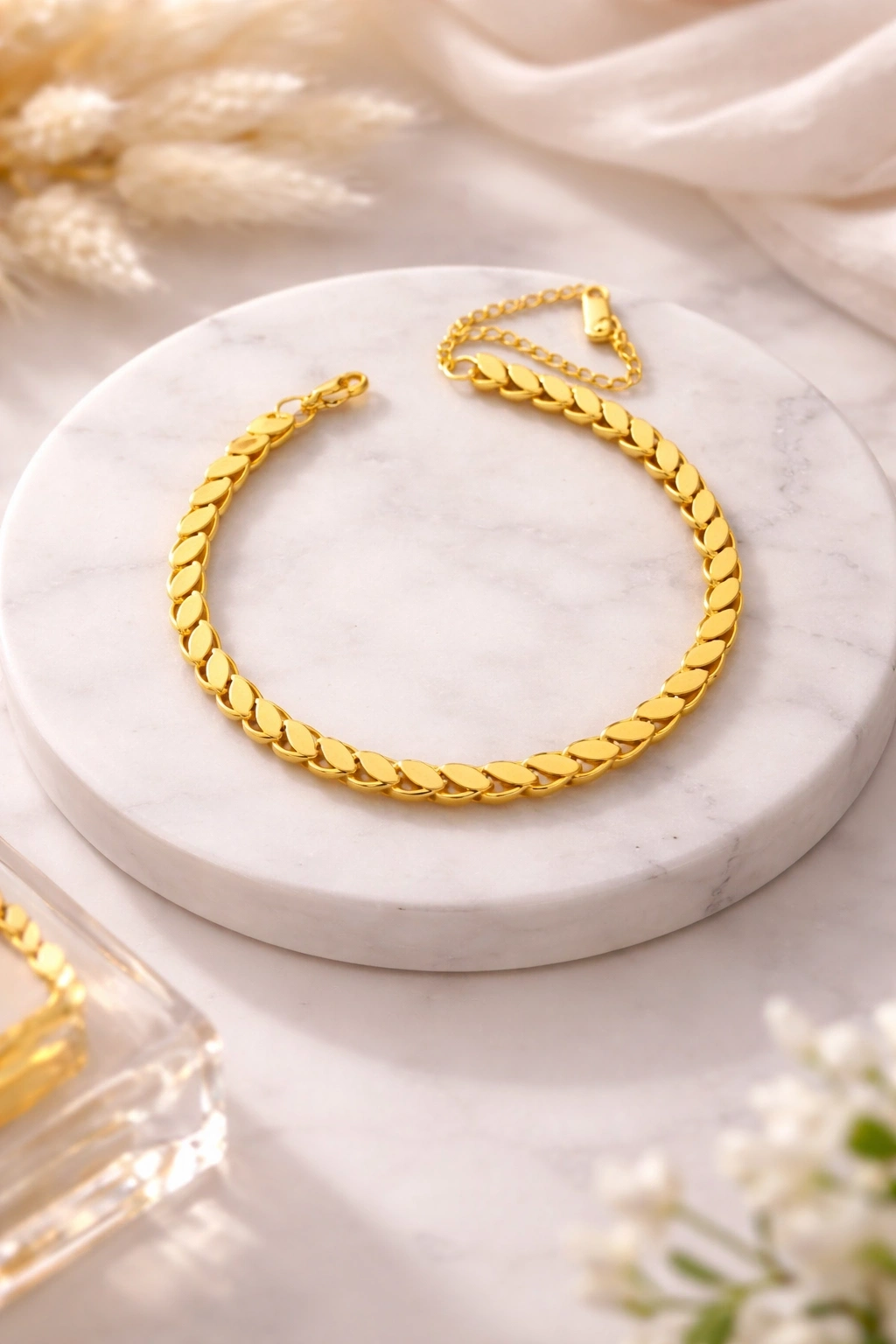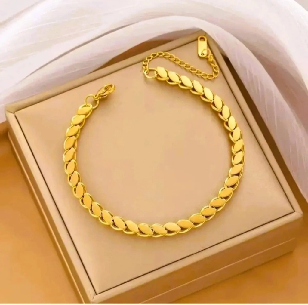 Modern ve zarif tasarımıyla öne çıkan Gold arpa zincir bileklik, günlük stilinize ışıltılı bir dokunuş katar. Parlak yüzeyi ve akıcı formu sayesinde hem tek başına hem de kombinlerle kusursuz uyum sağlar. Paslanmaz çelik yapısı ile uzun ömürlü kullanım sunarken, altın ton kaplamasıyla lüks bir görünüm elde edersiniz.