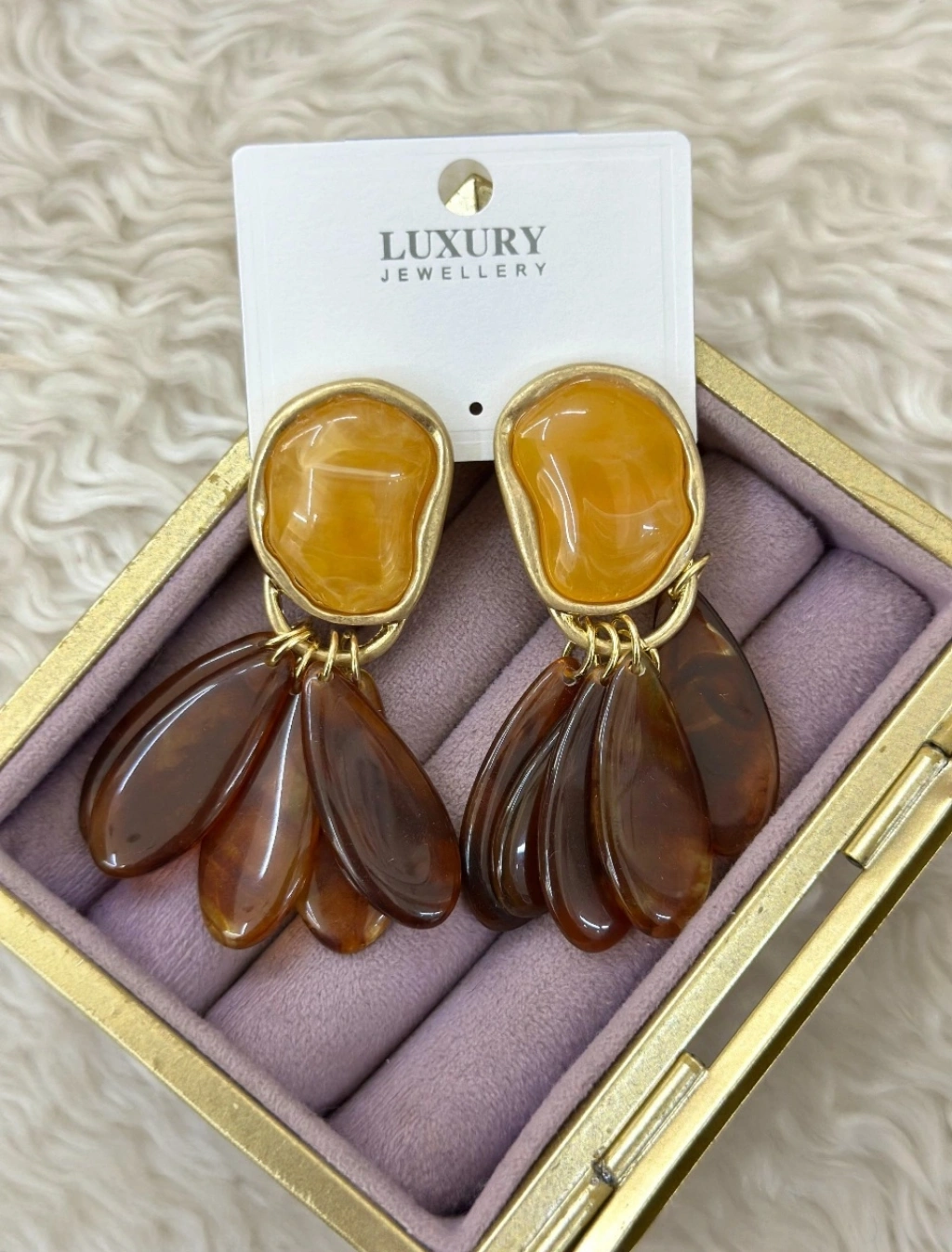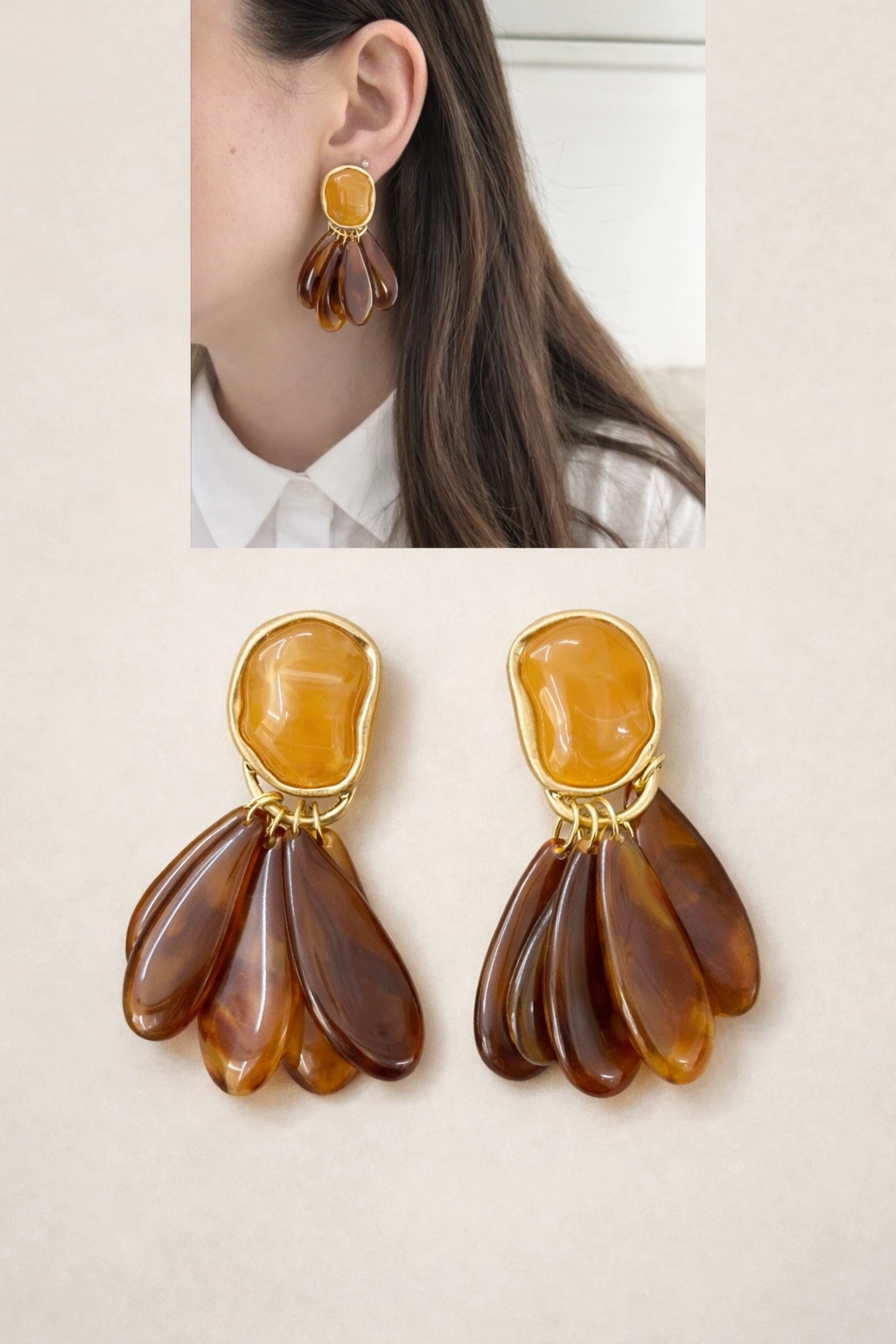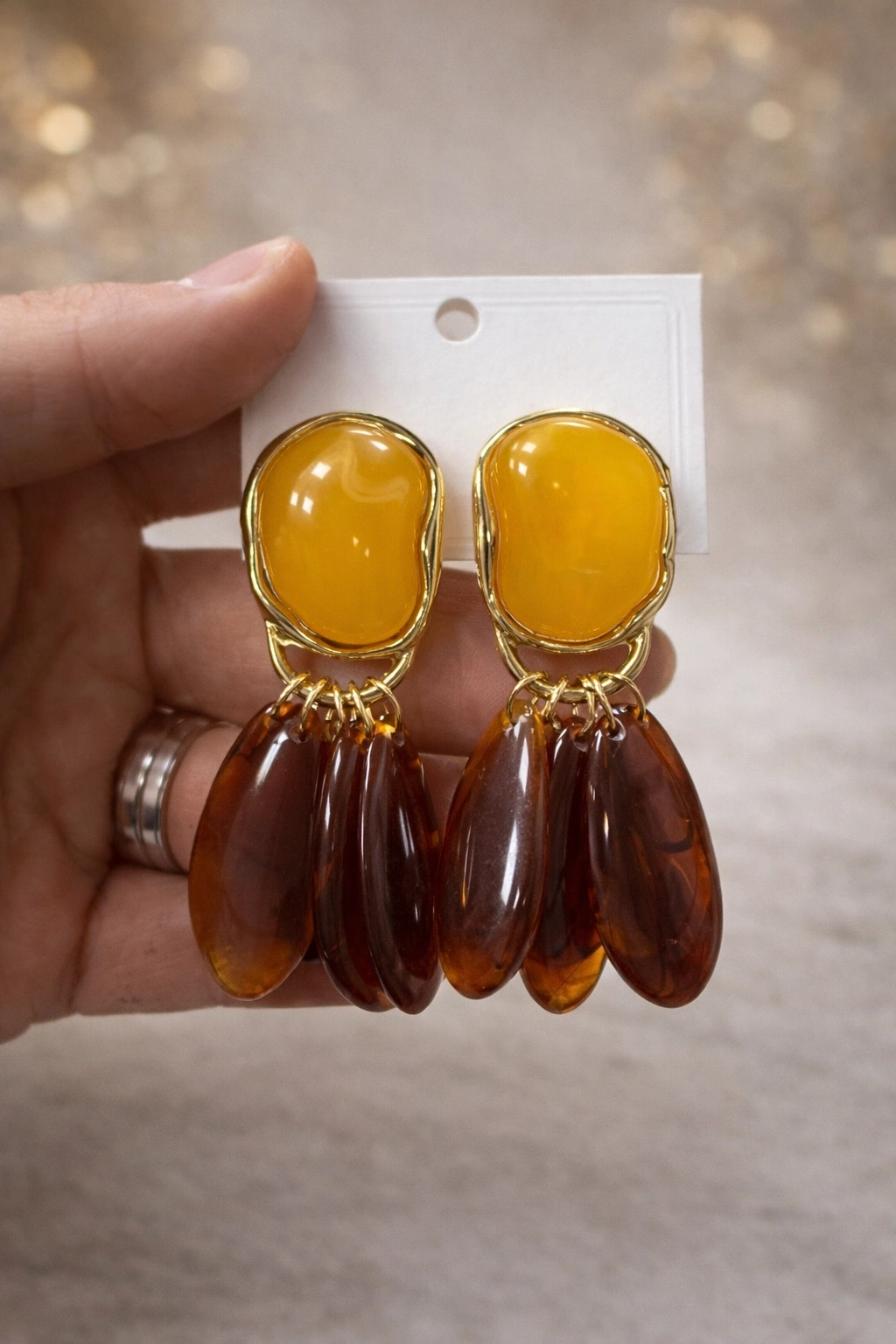 Doğal tonların zarafetiyle stilinizi tamamlayın! Amber (kehribar) tonlarından ilham alan bu sallantılı küpe, sıcak renk geçişleri ve hareketli formuyla göz alıcı bir görünüm sunar. Gold detaylarla birleşen özel tasarımı sayesinde hem doğal hem de şık bir stil yaratır.