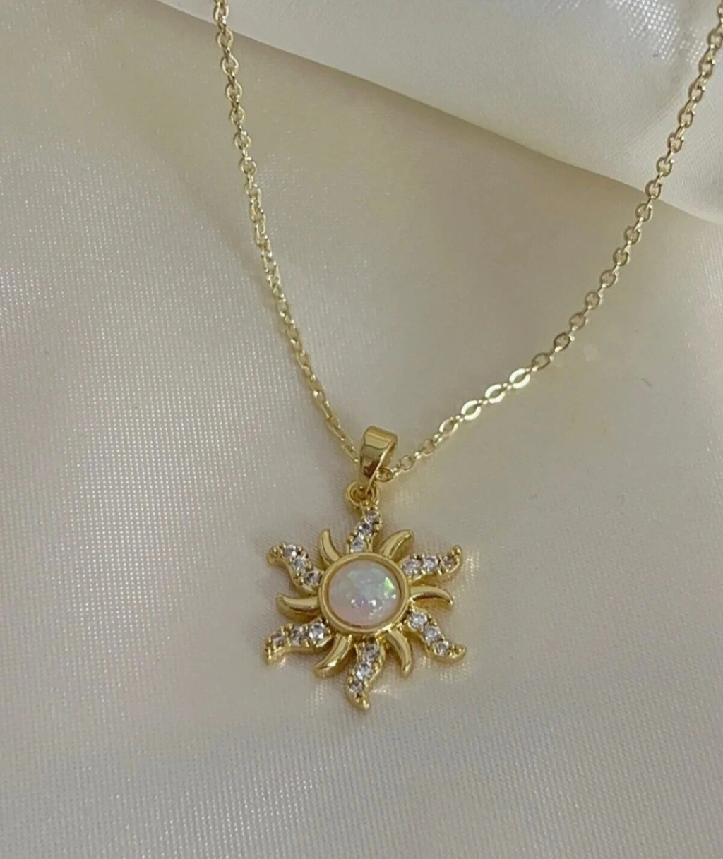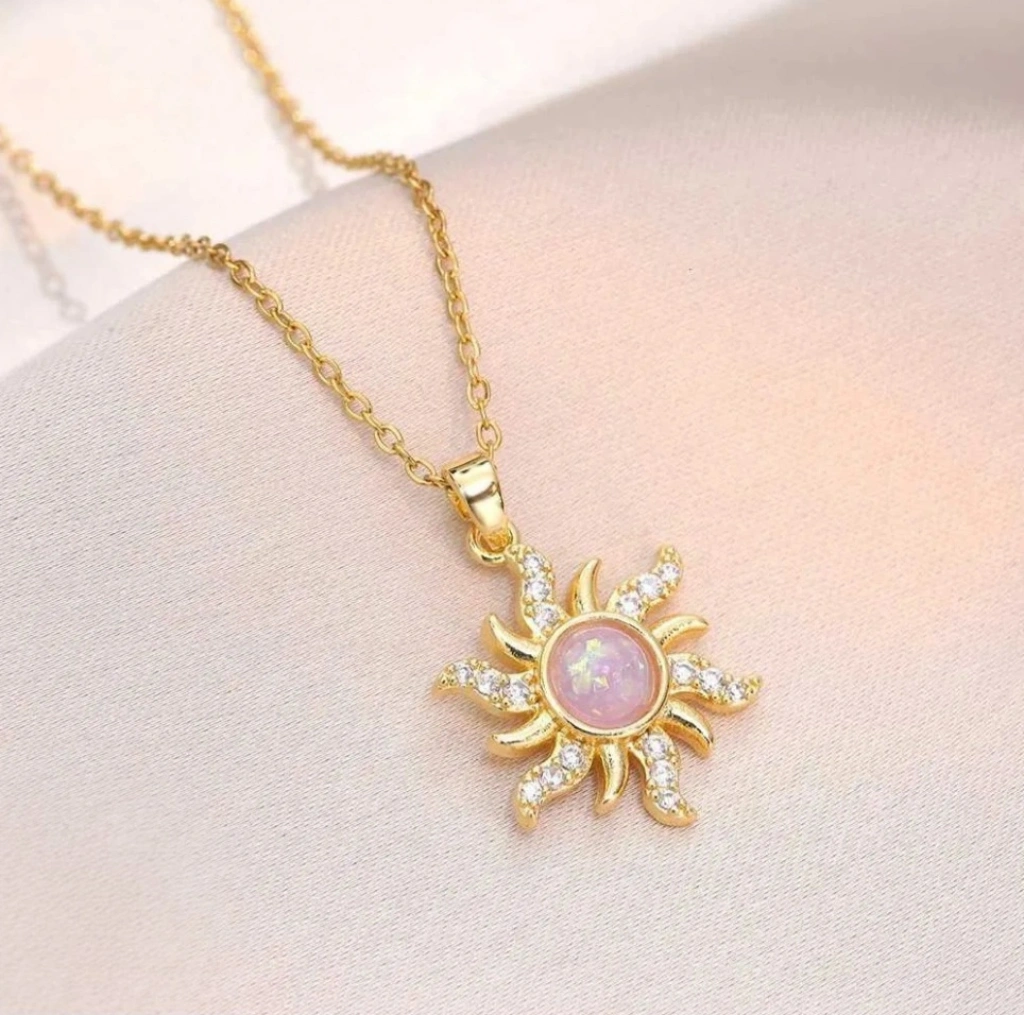 lüks gold kolye, pembe taşlı kolye, güneş figürlü kolye, premium çelik kolye, kadın lüks kolye, Naaksesuar kolye