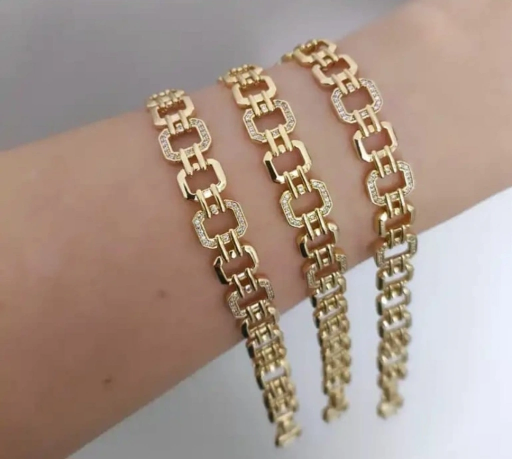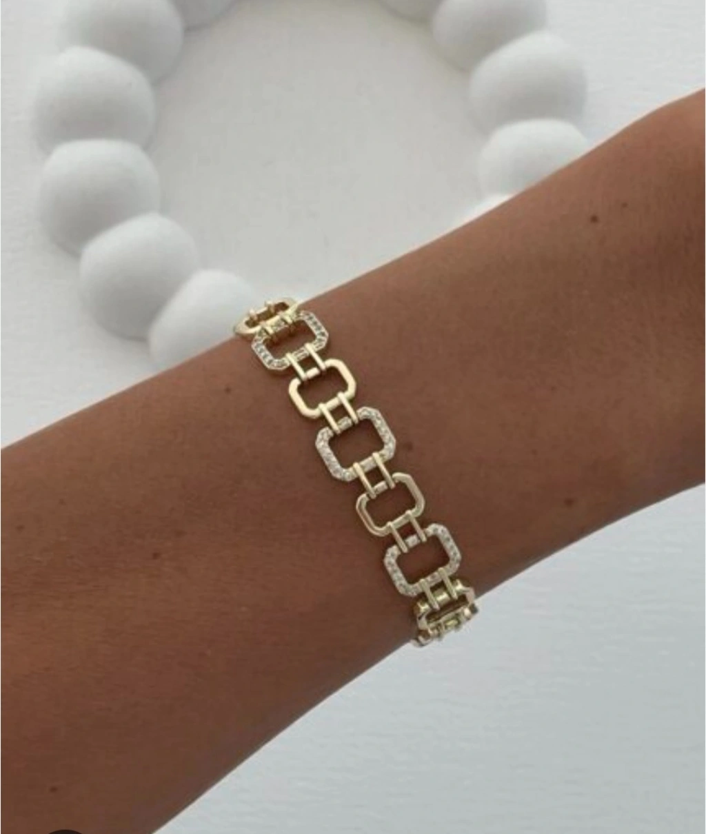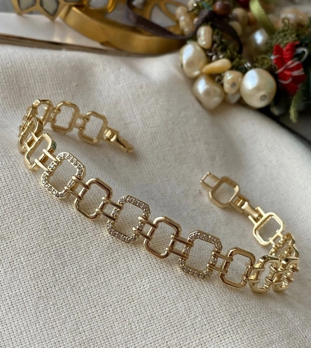 Şıklığı ve zarafeti bir arada sunan gold renk geometrik zincir kadın bileklik, modern tasarımı ve göz alıcı taş detayları ile stilinize zarif bir dokunuş katar. Kare formdaki özel tasarım halkalar ve parlak taş işlemeleri sayesinde günlük kombinlerden özel davetlere kadar her ortamda şık bir görünüm sağlar.