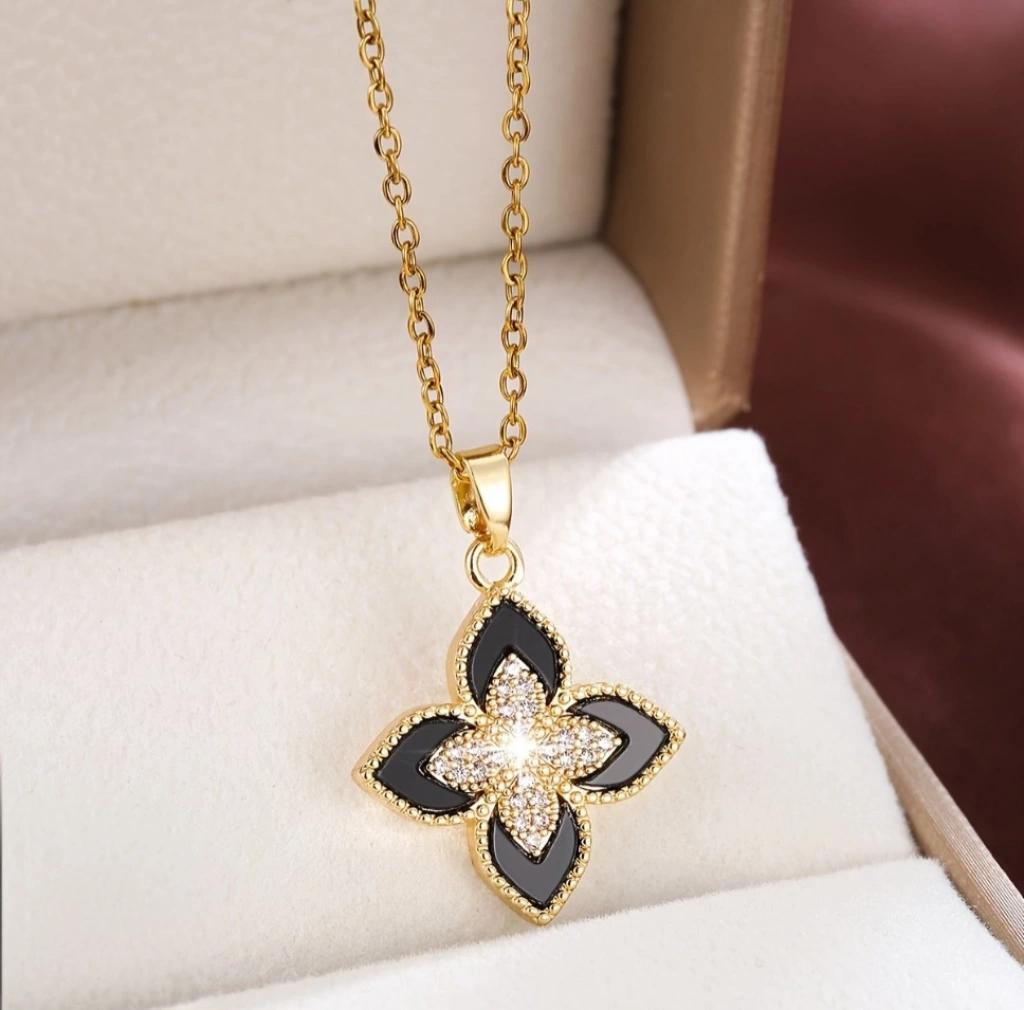 Gold Renk VC Model Siyah Detaylı Çiçek Kolye – Işıltılı ve Asil Tasarım