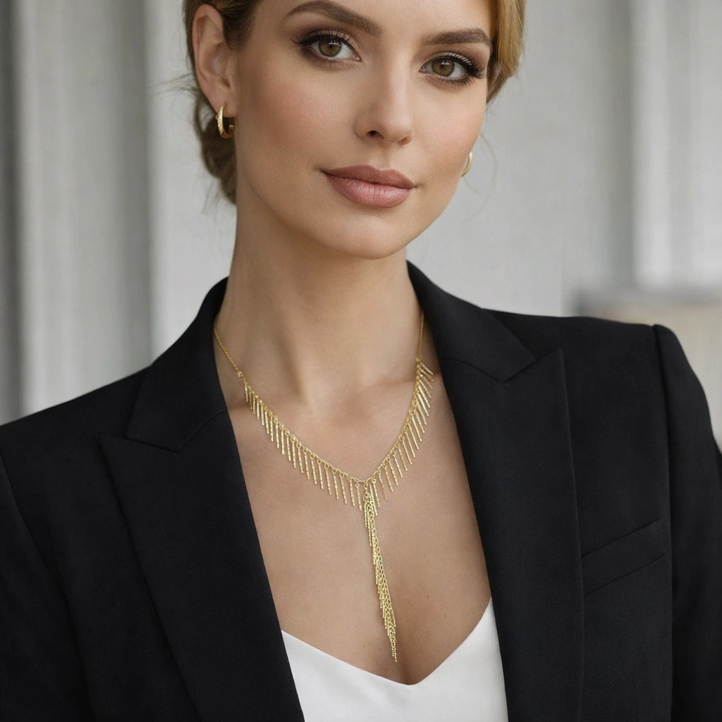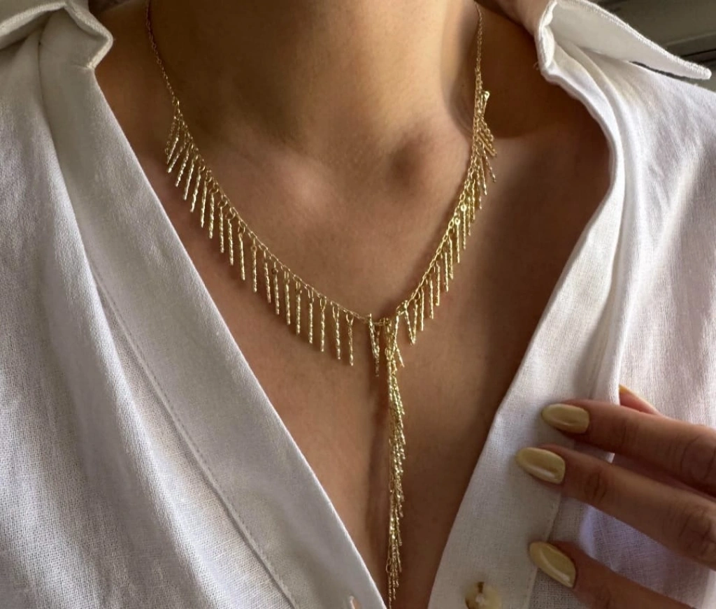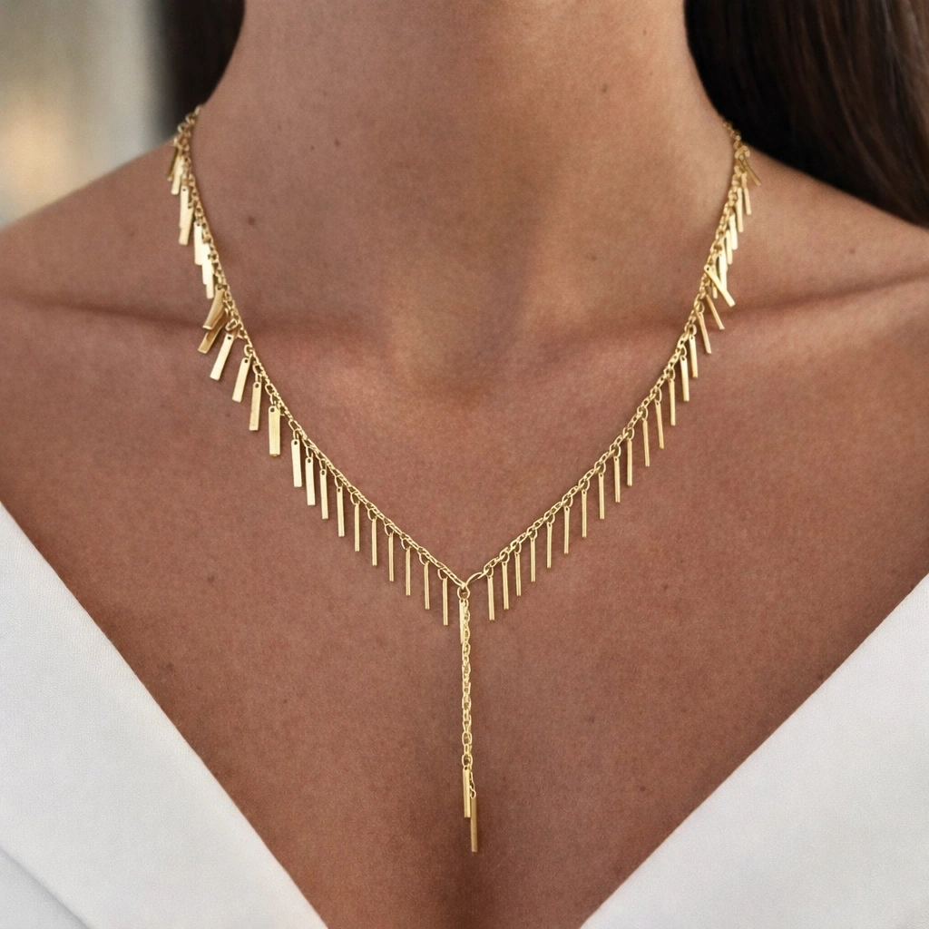 Modern çizgileri ve zarif sallantı formu ile tasarlanan Gold Renkli 14K Kaplamalı Lüks Kolye, feminen ve güçlü bir stilin en şık tamamlayıcısıdır. Boyun hattını V formunda zarifçe saran tasarımı ve merkezdeki minimal zincir detayı sayesinde dikkat çekici, sofistike bir görünüm sunar.