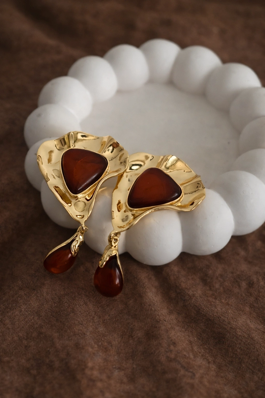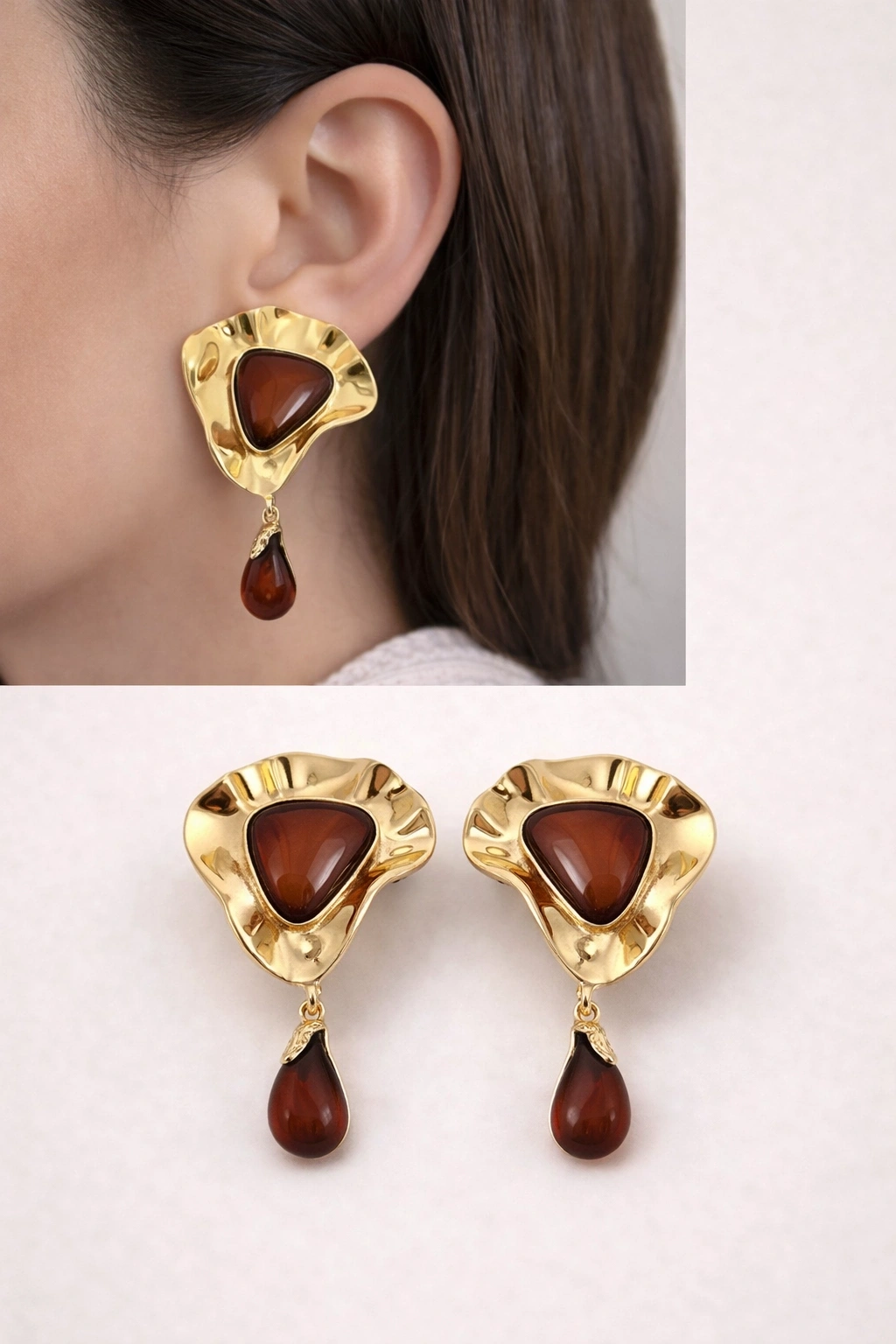 Zarafet ve asaletin buluştuğu özel tasarım! Organik formda gold yüzey ve derin bordo taş detayıyla tasarlanan bu sallantılı küpe, güçlü ve sofistike bir stil sunar. Işıltılı gold dokusu ile kontrast oluşturan bordo taş, her kombine şık ve dikkat çekici bir dokunuş katar.