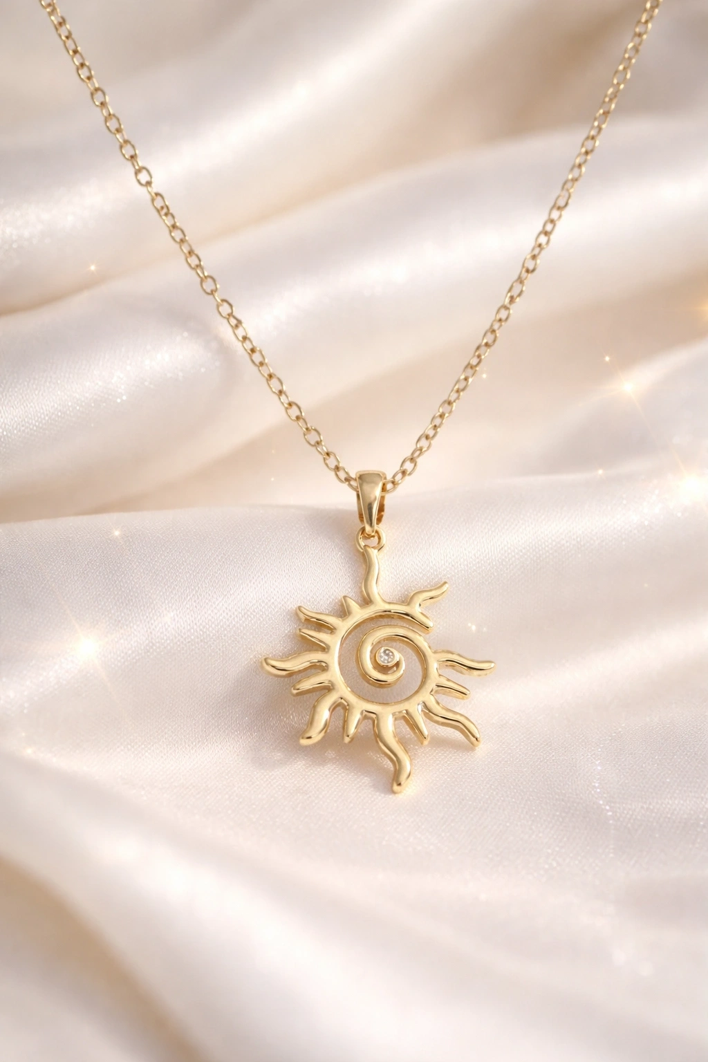 Zamansız tasarımı ve güçlü sembolizmi bir araya getiren bu özel güneş figürlü kolye, stilinize sıcak ve göz alıcı bir dokunuş katmak için tasarlandı. Enerji, yaşam ve ışığın simgesi olan güneş formu; merkezindeki spiral detay ile modern ve sofistike bir estetik sunar.