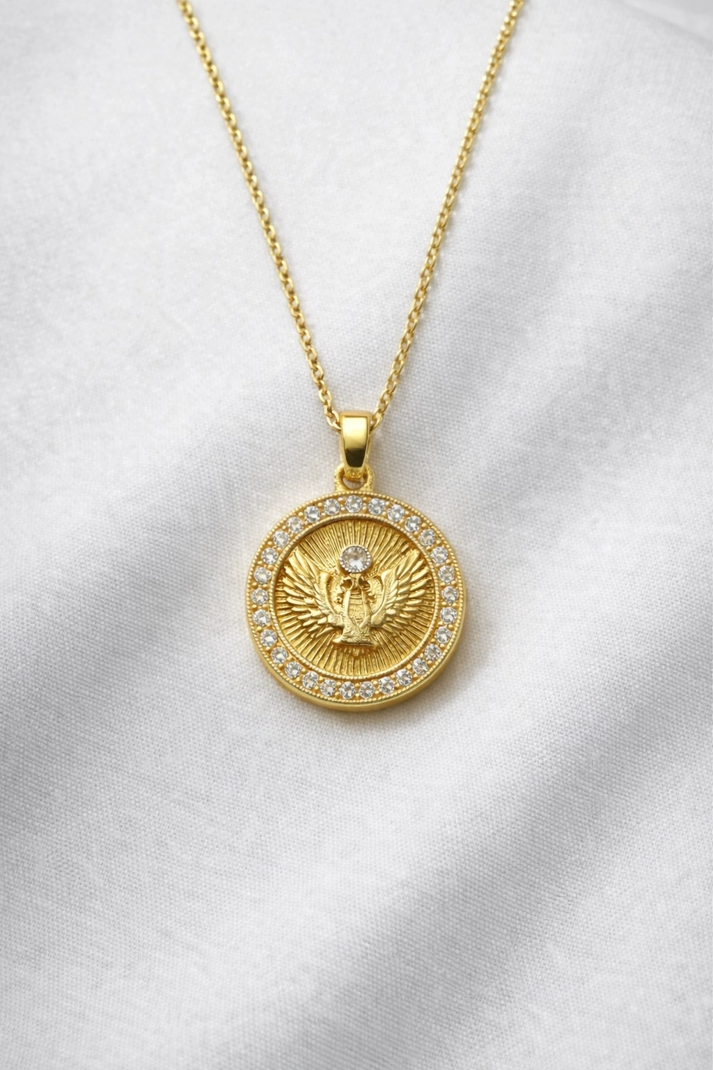 Zarafeti ve güçlü tasarım detaylarını bir araya getiren gold renkli çelik madalyon kolye, stiline anlam katmak isteyenler için özel olarak tasarlandı. Göz alıcı parlak taş detaylarıyla çevrili yuvarlak form ve ortasındaki dikkat çekici figür, kolyeye hem klasik hem de modern bir hava kazandırır.
