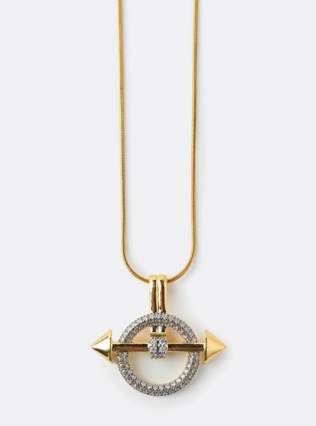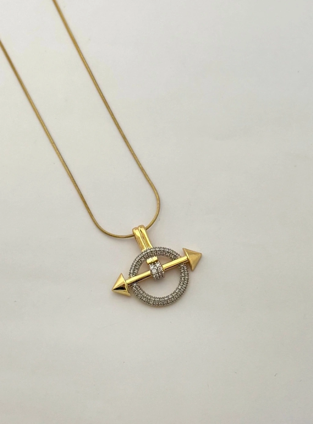 Ok figürü; güç, yön ve kararlılığı simgelerken, taşlı halka detayı kolyeye ışıltılı ve premium bir hava kazandırır. Günlük kombinlerden özel davet stiline kadar rahatlıkla kullanılabilir.