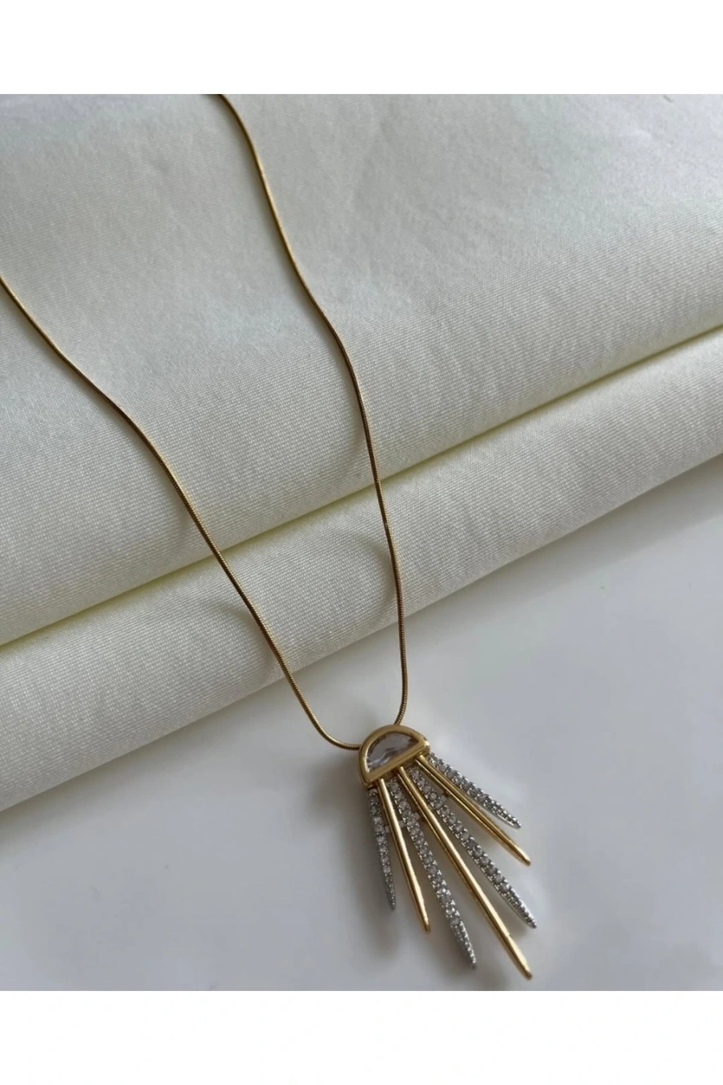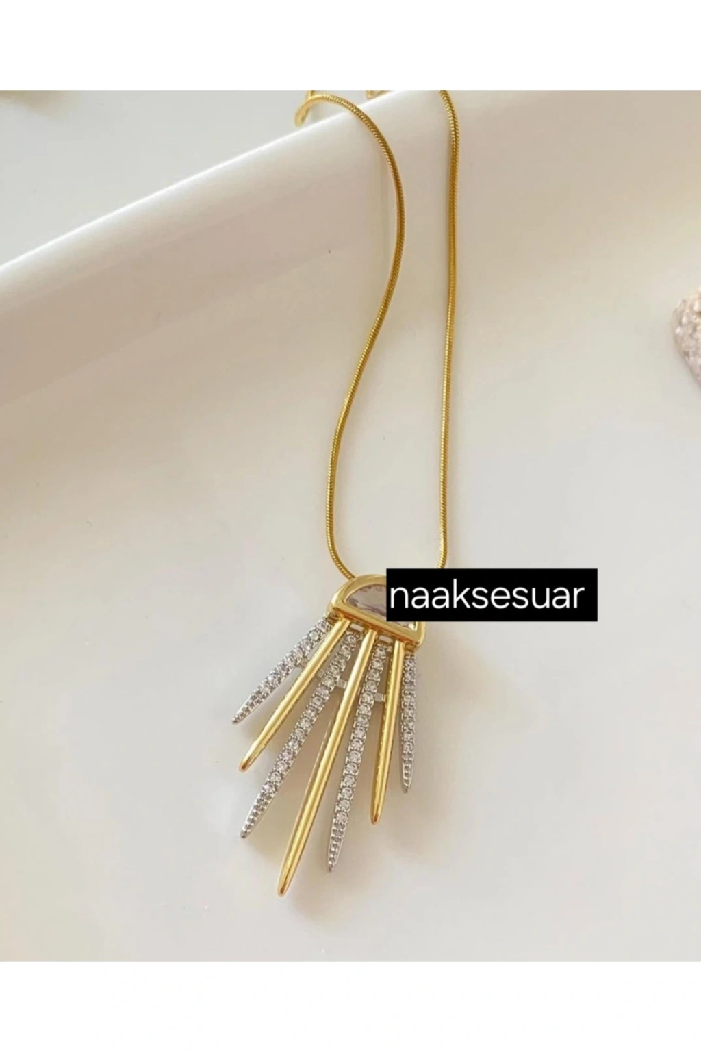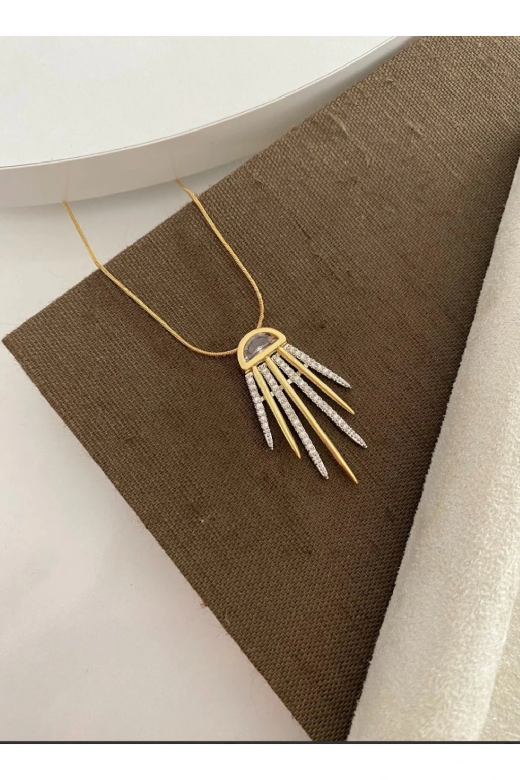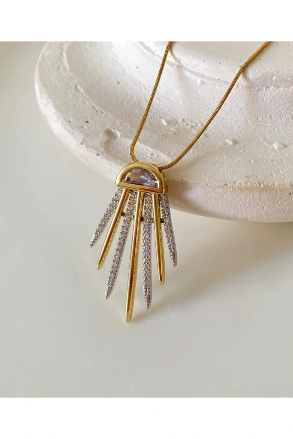 Gold Renkli Çelik Özel Seri Taşlı KolyeModern tasarımı ve zarif ışıltısıyla öne çıkan Gold renkli çelik özel seri taşlı kolye, şıklığıyla her kombini tamamlayan özel bir aksesuardır.; 316L paslanmaz çelikten üretilmiş olan bu kolye, kararma yapmaz, antialerjik yapısıyla uzun ömürlü kullanım sunar.; Kolye ucundaki özel tasarım geometrik form ve taş detayları, gün ışığını yansıtarak büyüleyici bir parlaklık sağlar.; Minimalist çizgilerle birleşen gold kaplama zincir, hem günlük kullanımlarda hem de özel davetlerde zarif bir duruş sergiler.; ✔️ 316L Çelik – Kararma yapmaz, dayanıklı ve uzun ömürlü✔️ Gold Kaplama – Modern ve şık görünüm✔️ Taş Detaylı Özel Seri Tasarım✔️ Antialerjik – Hassas ciltler için güvenli✔️ Hediye için idealGünlük kombinlerden gece şıklığına kadar uyum sağlayan bu kolye, Naaksesuar’ın özel serisi olarak koleksiyonunuzda mutlaka yer almalı.