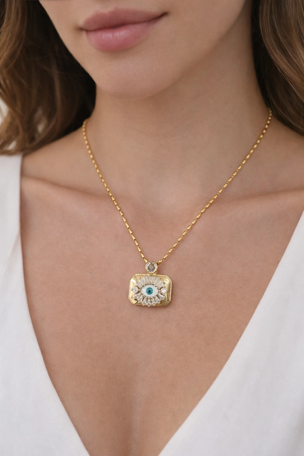 Gold renkli özel plaka formu ve göz detayıyla tasarlanan çelik kolye, modern şıklığı zarif taş detaylarıyla buluşturan dikkat çekici bir aksesuardır ✨ Paslanmaz çelik yapısı sayesinde kararma yapmaz, uzun süre parlaklığını korur ve günlük kullanıma uygundur. Işıltılı taş süslemeleri ve trend nazar figürü sayesinde hem tek başına hem kombin kolye kullanımında güçlü bir görünüm sunar ? Günlük stil, özel gün kombinleri ve hediye tercihi için ideal bir seçenektir