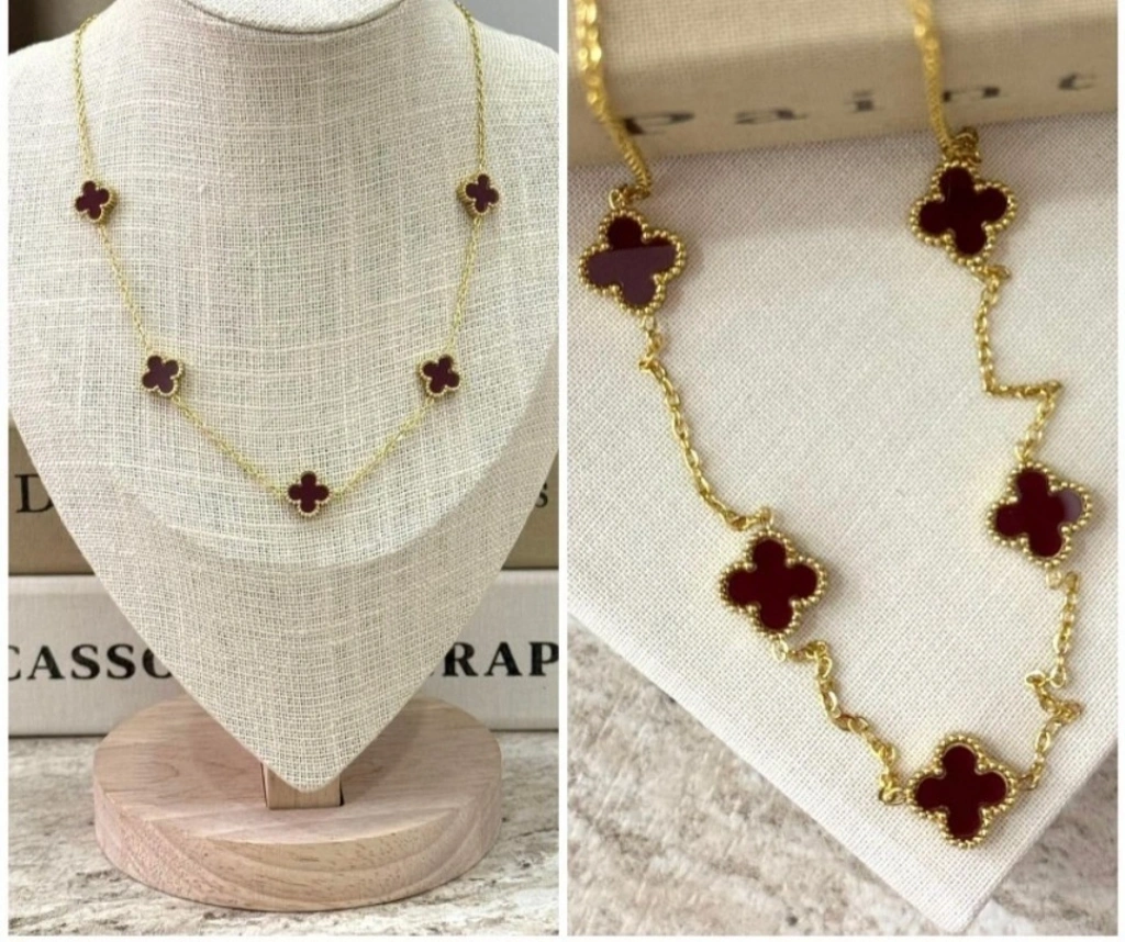 Zamansız şıklığın ve güçlü stilin simgesi olan yonca figürü, kırmızı ve bordo tonlarının dikkat çekici enerjisiyle buluşuyor. Gold renk zincir detayı ve özel kesim yonca formları sayesinde hem günlük kombinlerde hem de özel davetlerde iddialı bir görünüm sunar.