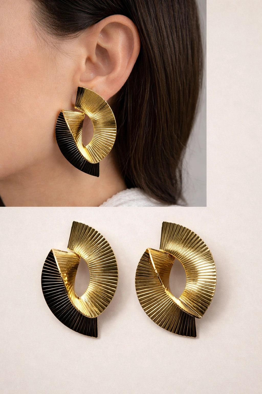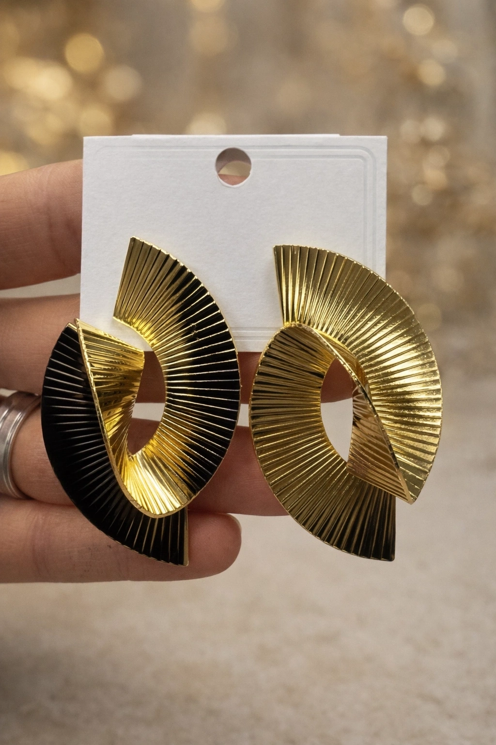 Özgün kıvrımlı formu ve ışıltılı gold tonu ile hem günlük kombinlerde hem de özel davetlerde rahatlıkla kullanabileceğiniz güçlü ve zamansız bir aksesuar parçasıdır.
