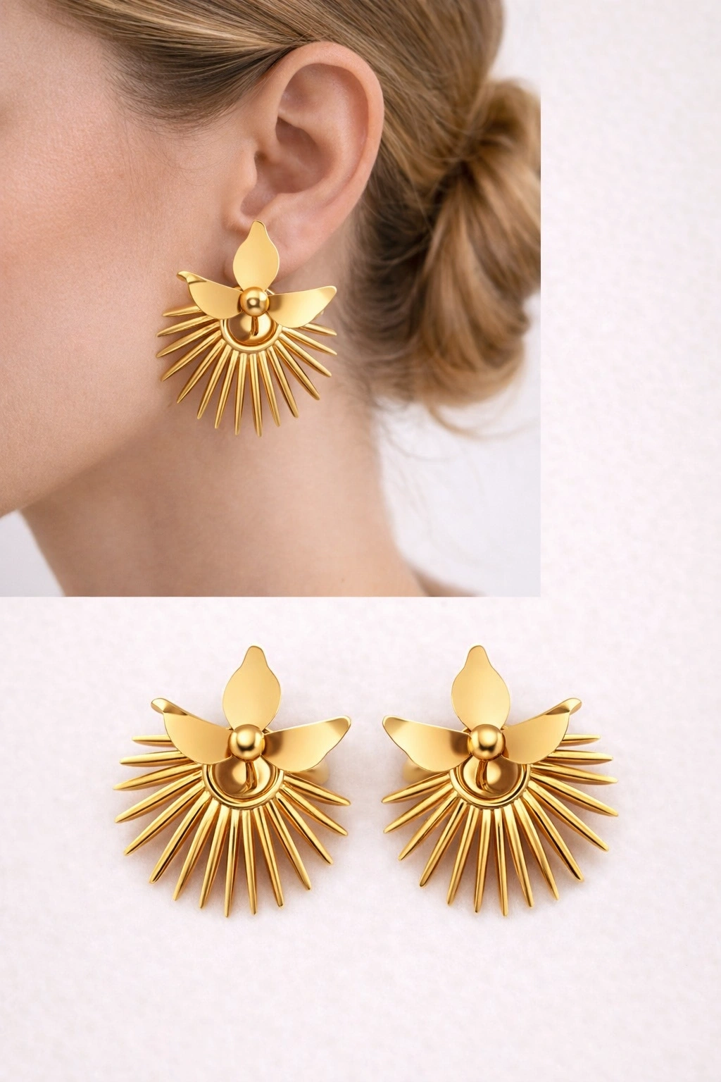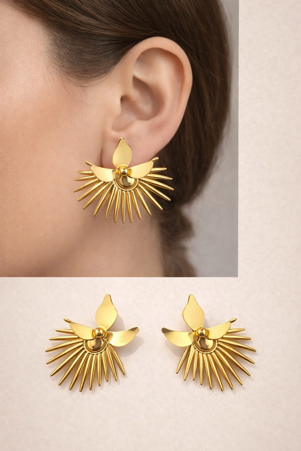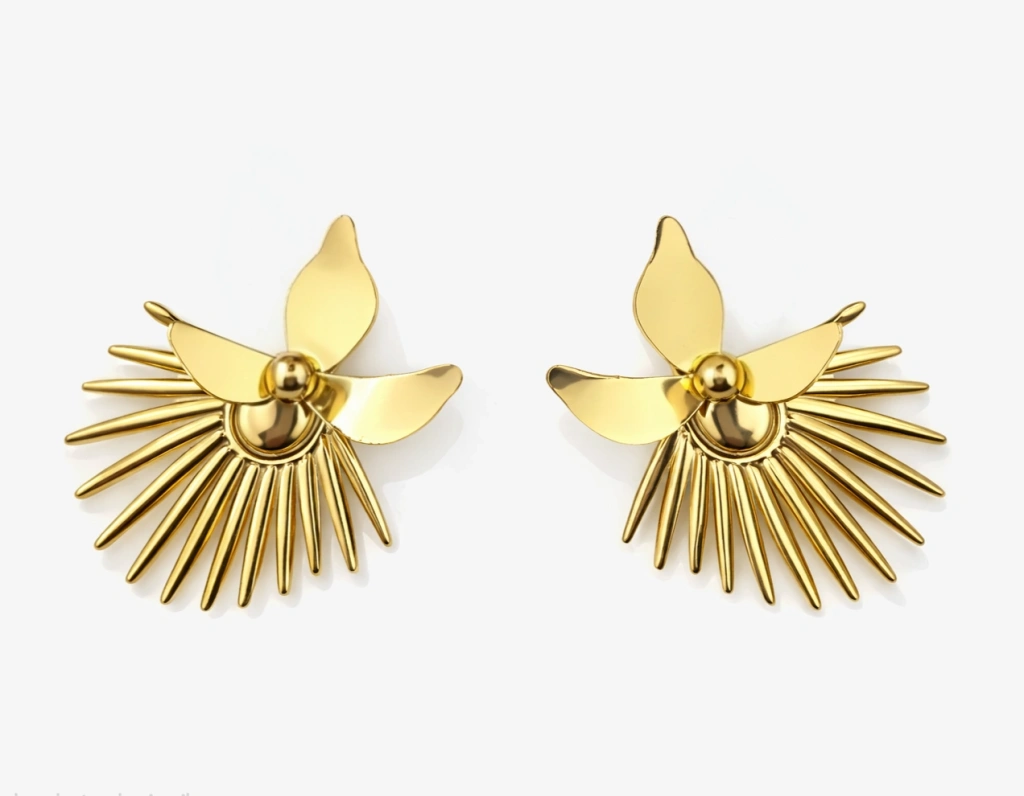 Modern çizgiler ve zarif detayların buluştuğu bu gold renkli küpe, stiline güçlü ve dikkat çekici bir dokunuş katmak isteyenler için tasarlandı. Işığı yansıtan parlak yüzeyi ve özgün formu sayesinde hem günlük kombinlerinde hem de özel günlerinde rahatlıkla kullanabilirsin.