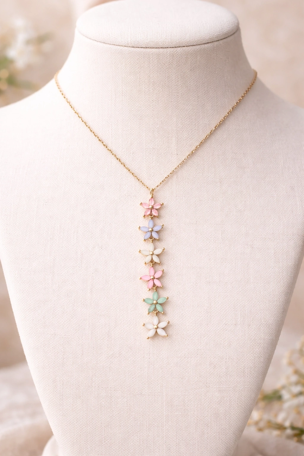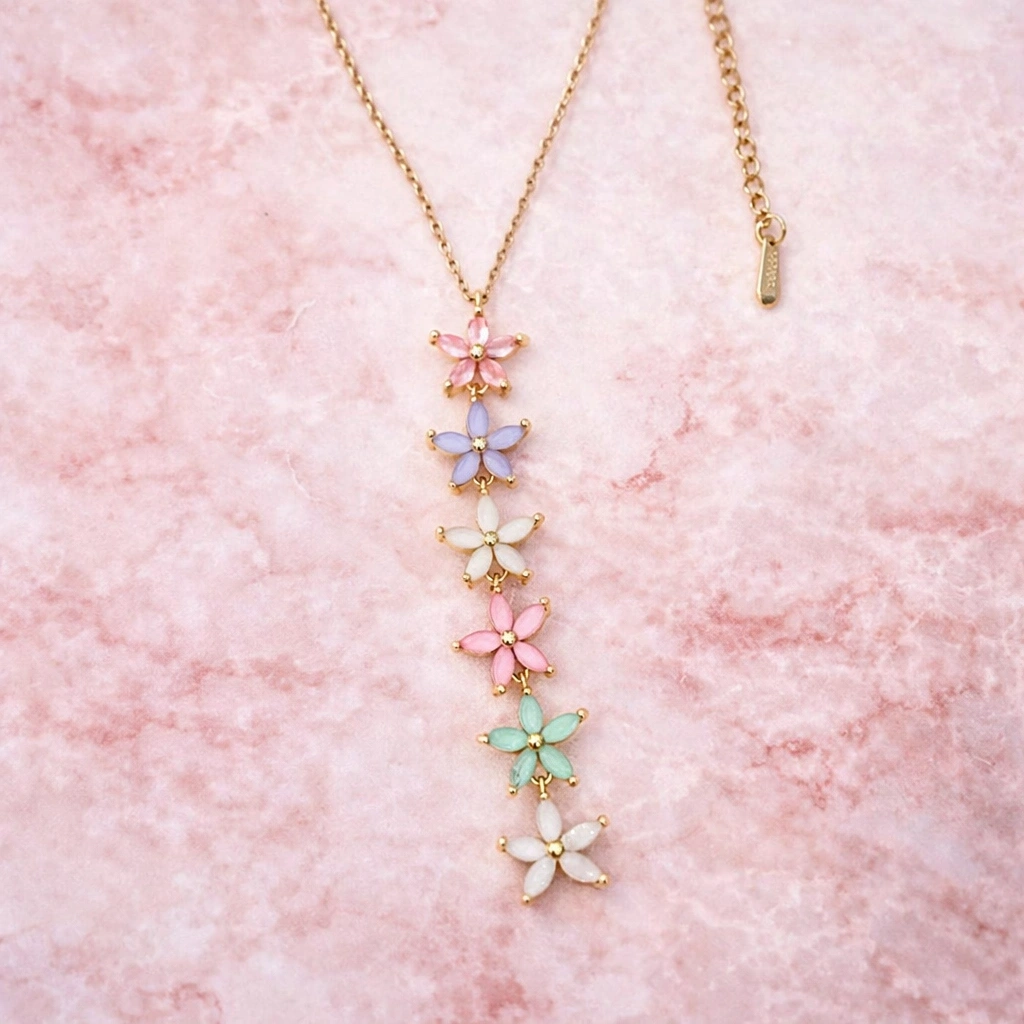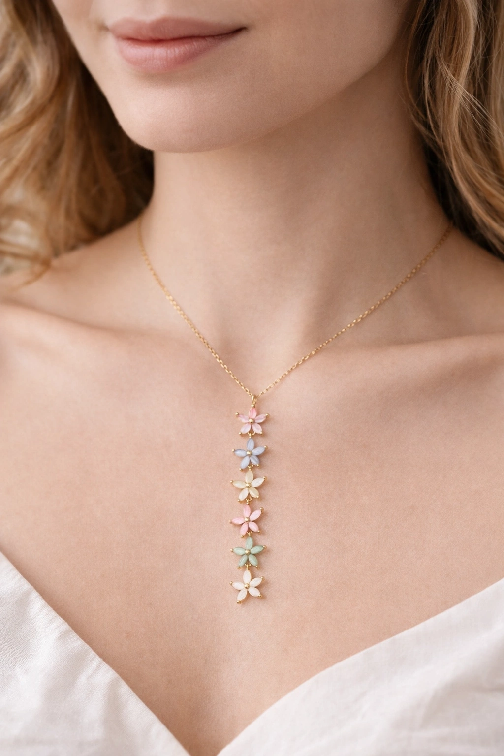 ? Gold Renkli Papatya Model Çoklu Çiçek Kolye – Pastel Taşlı