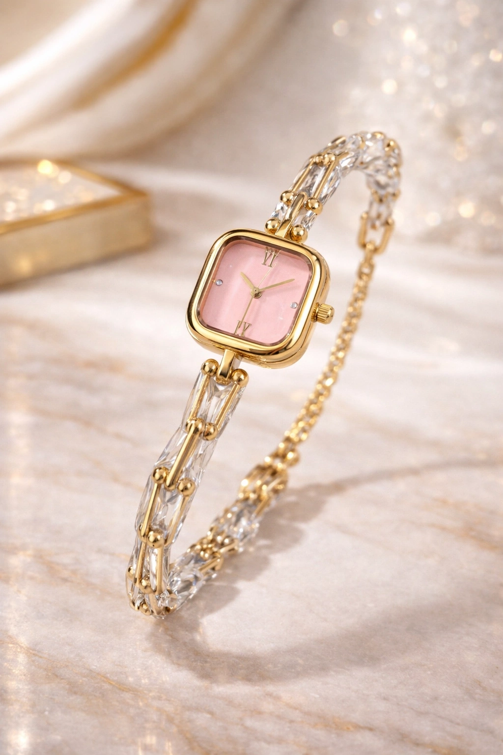 Gold Renkli Tiff Model Pudra Pembe Kadran Taşlı Lüks Kadın Saat – Zarif ve Modern Tasarım