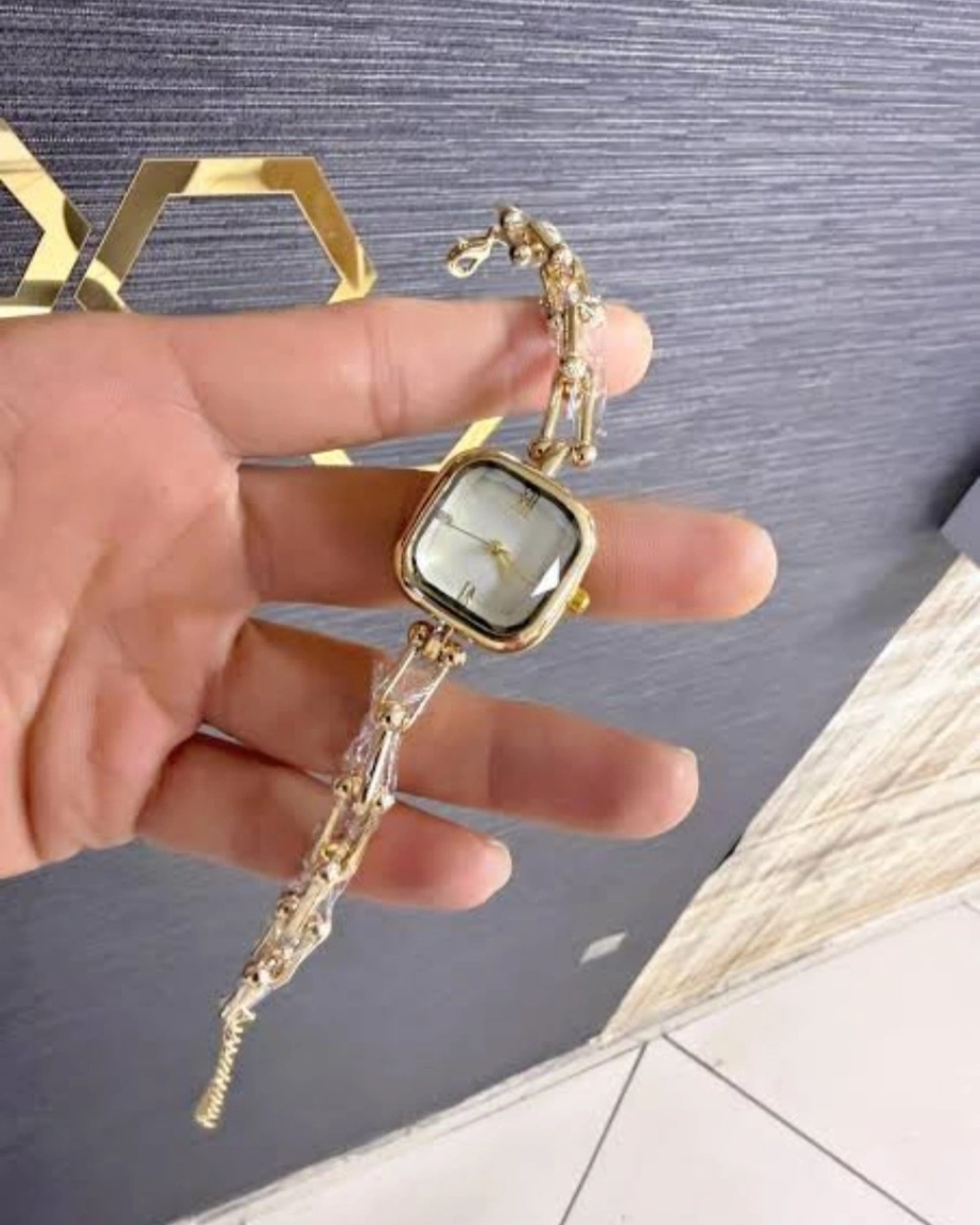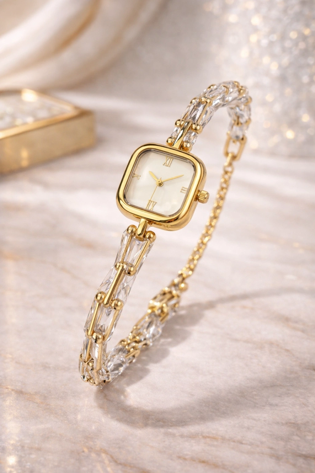 Gold renkli Tiff model taş detaylı kadın saat, zarif tasarımı ve şık sedef tonlu kadranı ile stilinizi tamamlayan özel bir aksesuardır. Modern kare kasa tasarımı ve açık sedef kadranı sayesinde klasik ve modern kombinlerle mükemmel uyum sağlar.