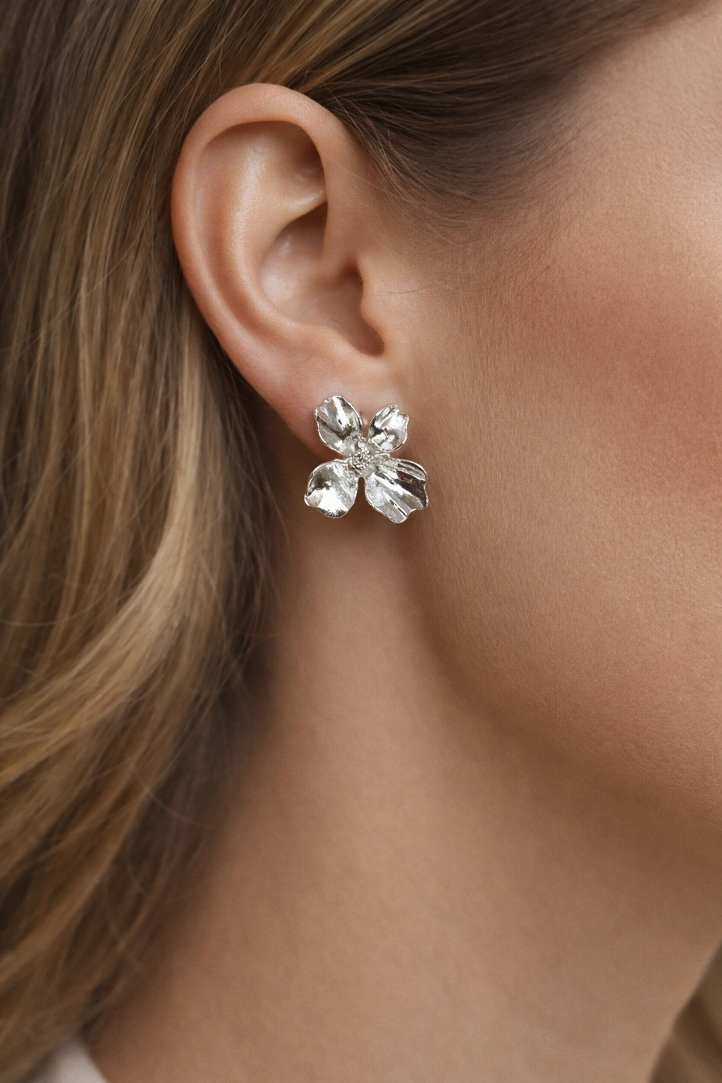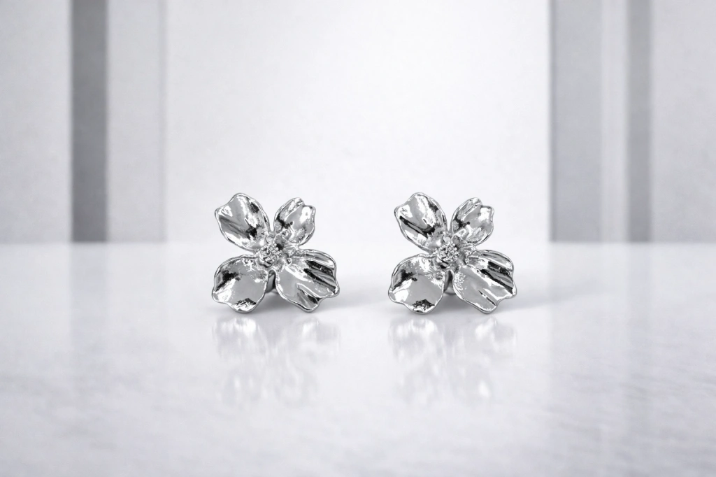 Gümüş Renk Lak Kaplama Çiçek Detaylı Küpe – Zarif ve Zamansız Şıklık