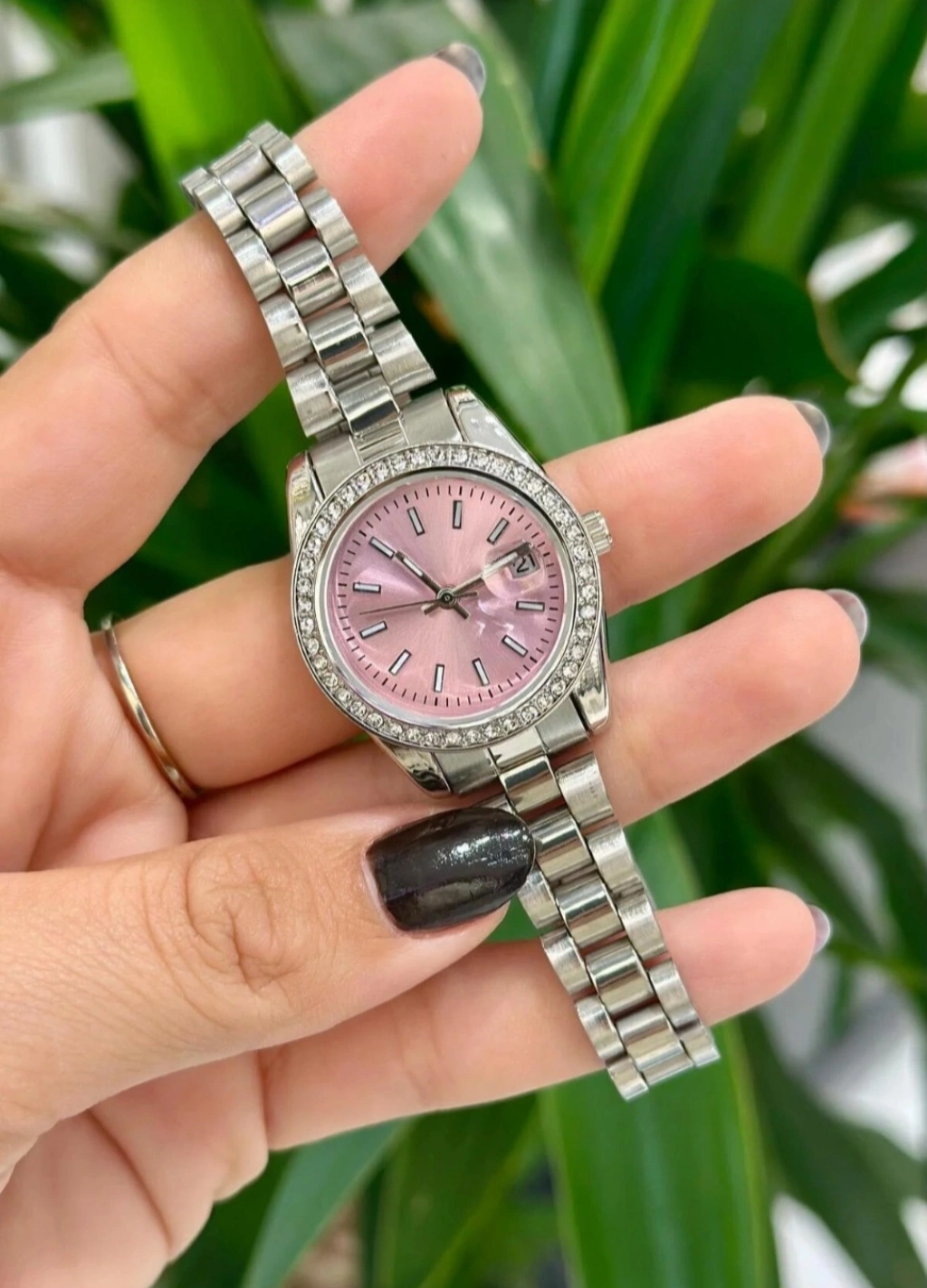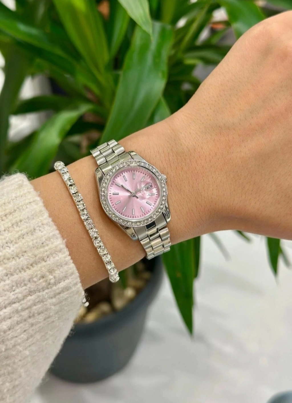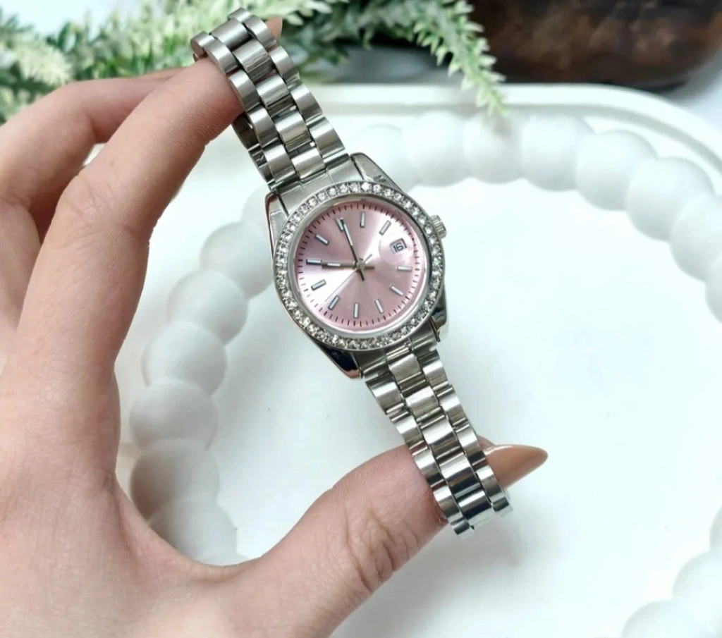 Zarif detayları ve şık tasarımıyla öne çıkan gümüş renkli marka model taşlı tasarım saat, modern ve feminen tarzı bir arada sunar. Pembe kadranı, taşlı indeksleri ve taş detaylı kasasıyla göz alıcı bir duruş sergiler.