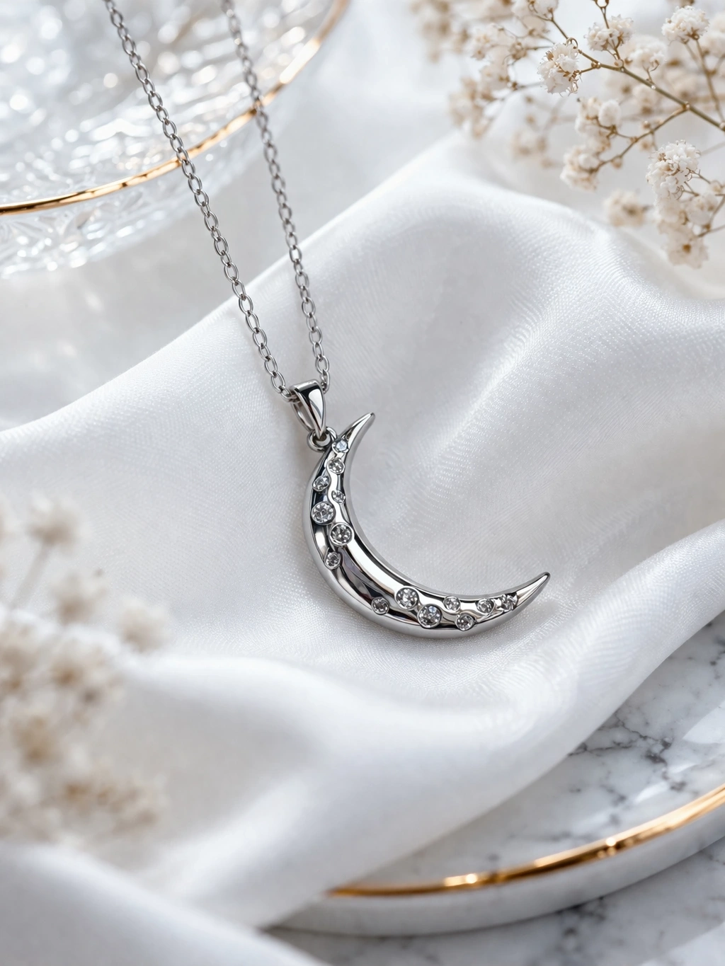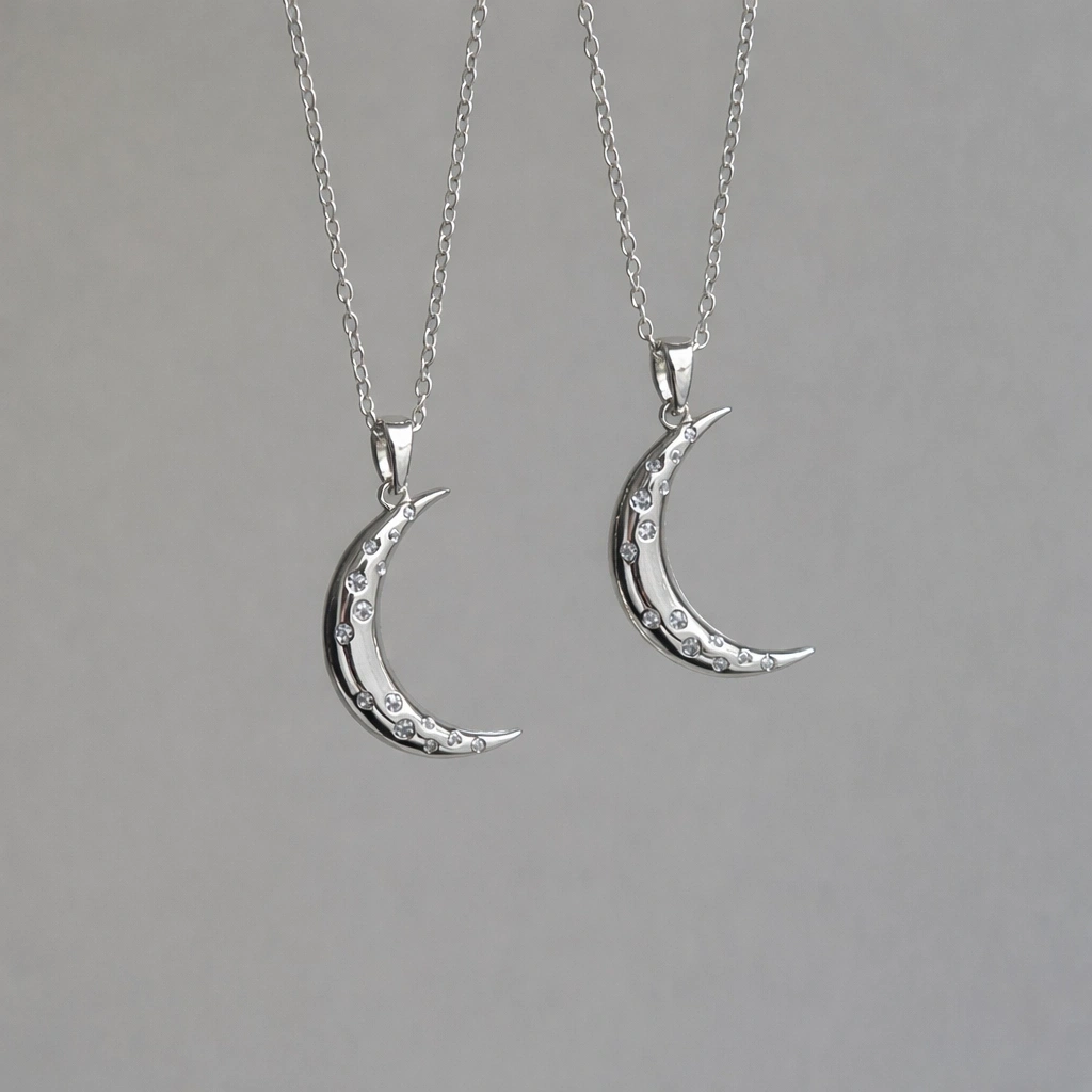 Gümüş Renkli Çelik Ay Figürlü Kolye – Zarafetin Işıltılı Yorumu