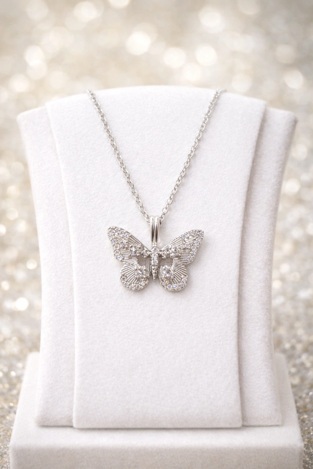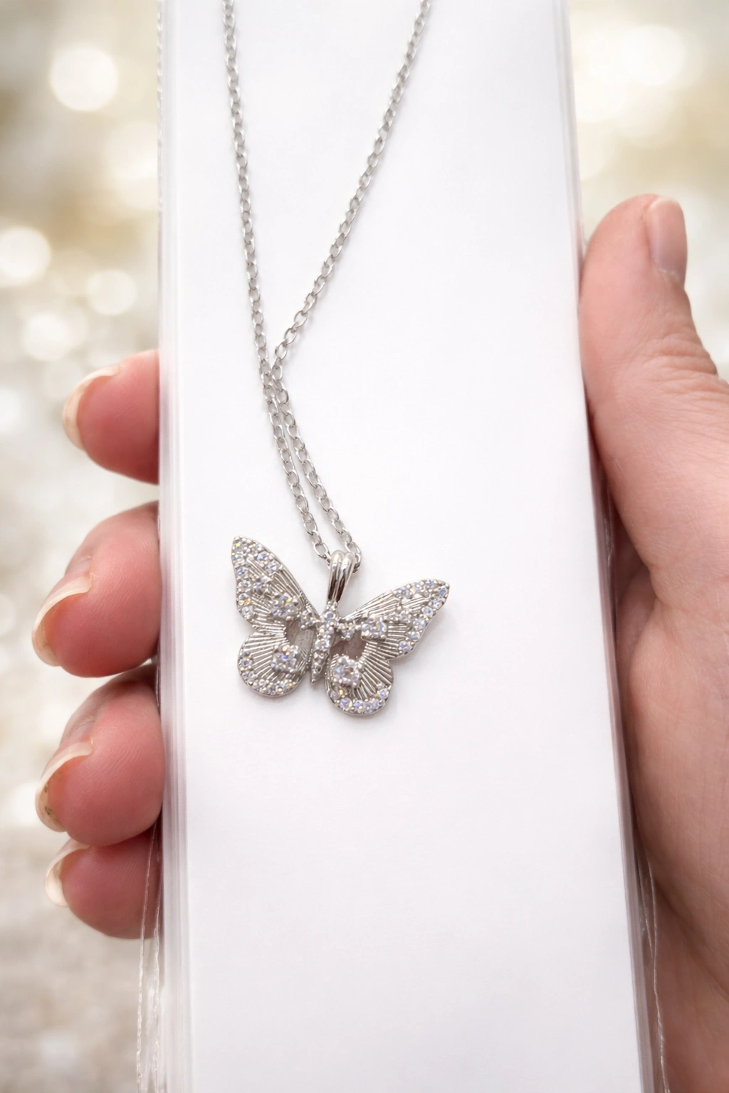 Gümüş Renkli Çelik Kelebek Kolye | Zirkon Taş Detaylı Zarif Tasarım