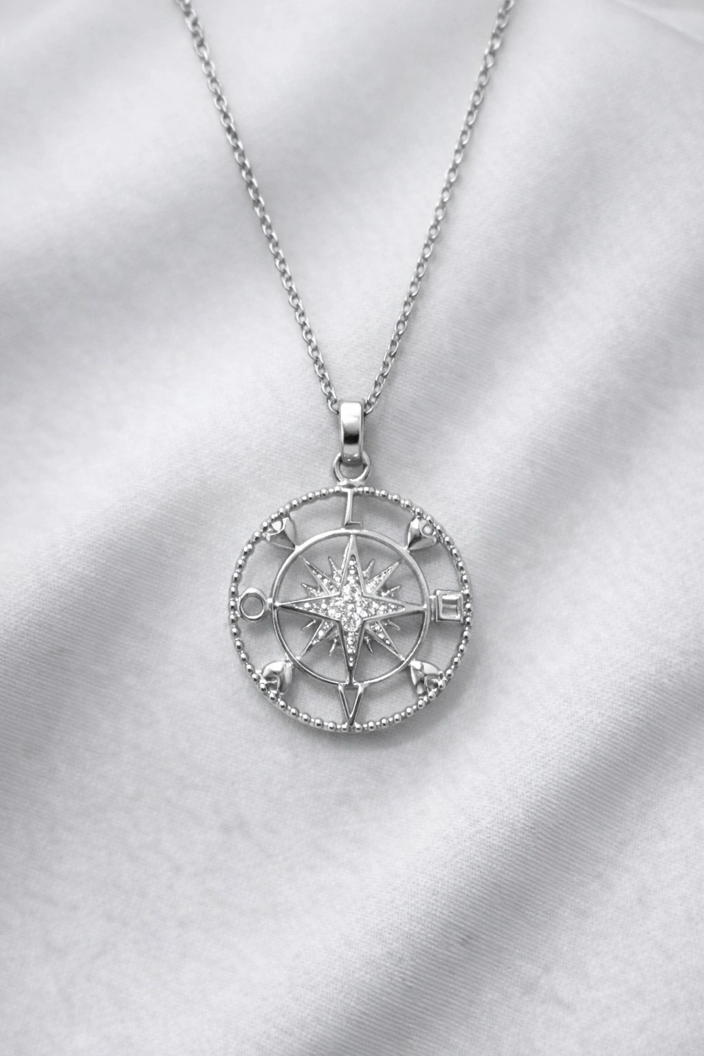 Merkezindeki parlak taşlı yıldız detayı ve ince işçilikle tasarlanmış pusula formu, ışığı etkileyici şekilde yansıtarak boynunda dikkat çekici bir görünüm oluşturur. Minimal ve modern tasarımı sayesinde hem tek başına hem de kombin kolyelerle rahatlıkla kullanılabilir.