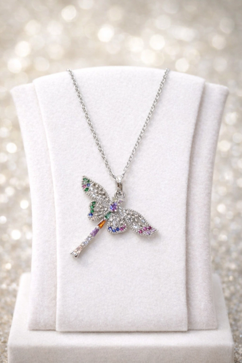 Gümüş Renkli Çelik Renkli Taş Detaylı Yusufçuk (Dragonfly) Kolye | Zarif ve Işıltılı Tasarım