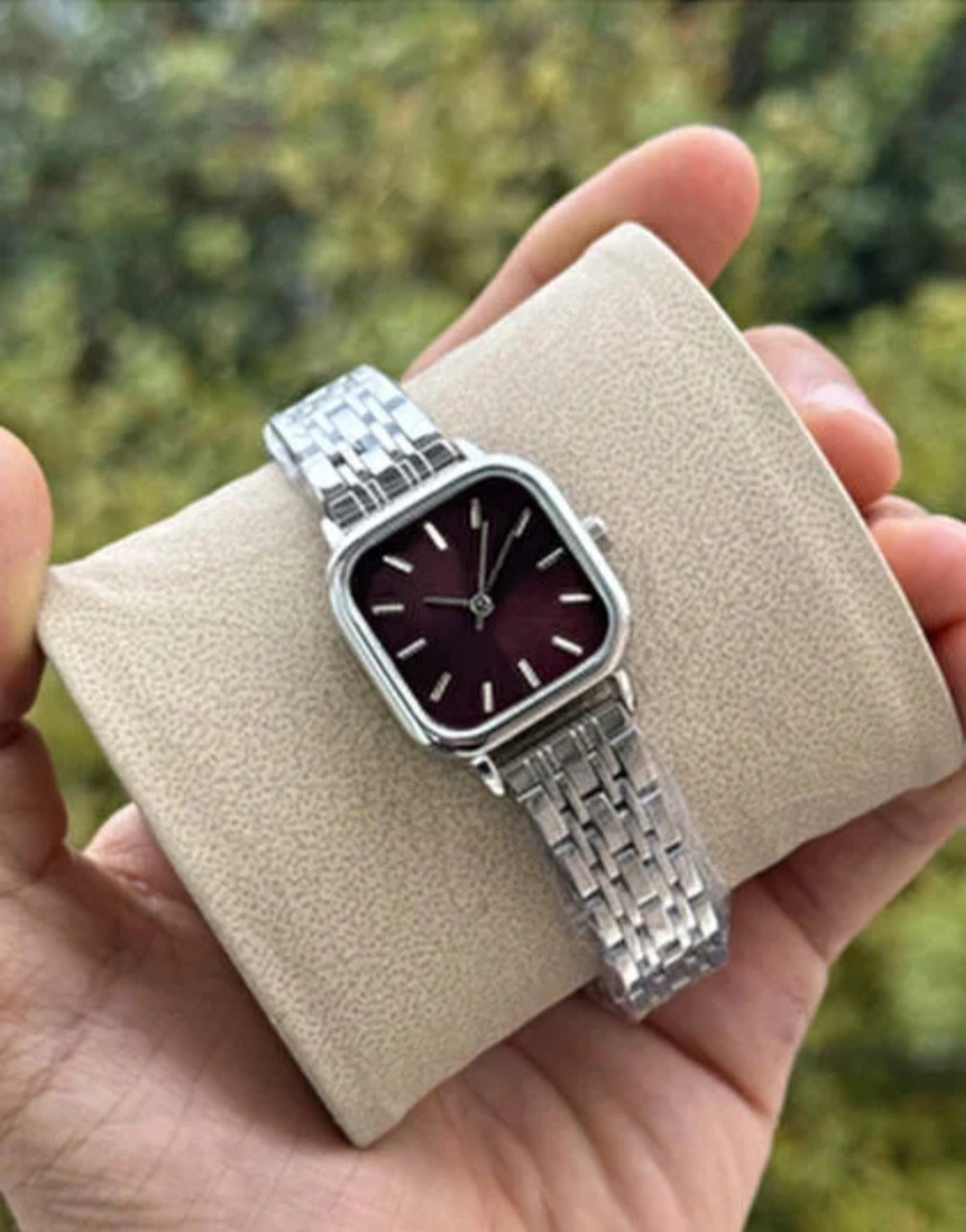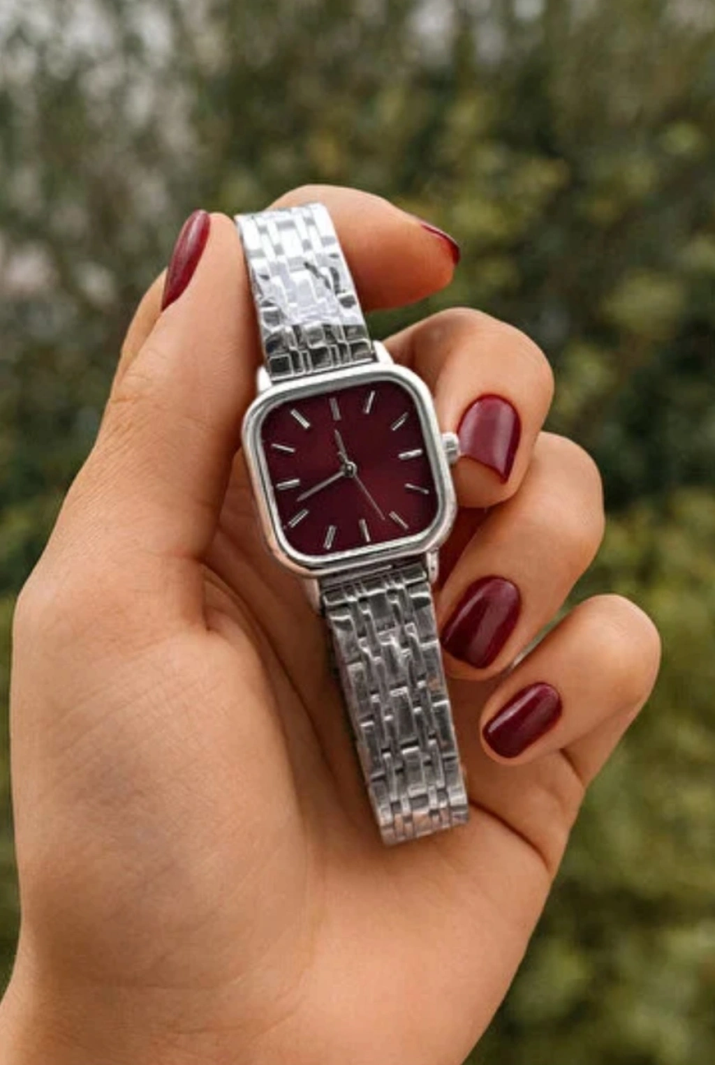 Minimal tasarımı ve güçlü duruşuyla öne çıkan gümüş renkli klasik kadın saat, modern kadının günlük stiline zarafet katmak için tasarlandı. Bordo kadran detayı ile sofistike bir görünüm sunarken, gümüş metal kordonu sayesinde hem spor hem klasik kombinlerle kusursuz uyum sağlar.