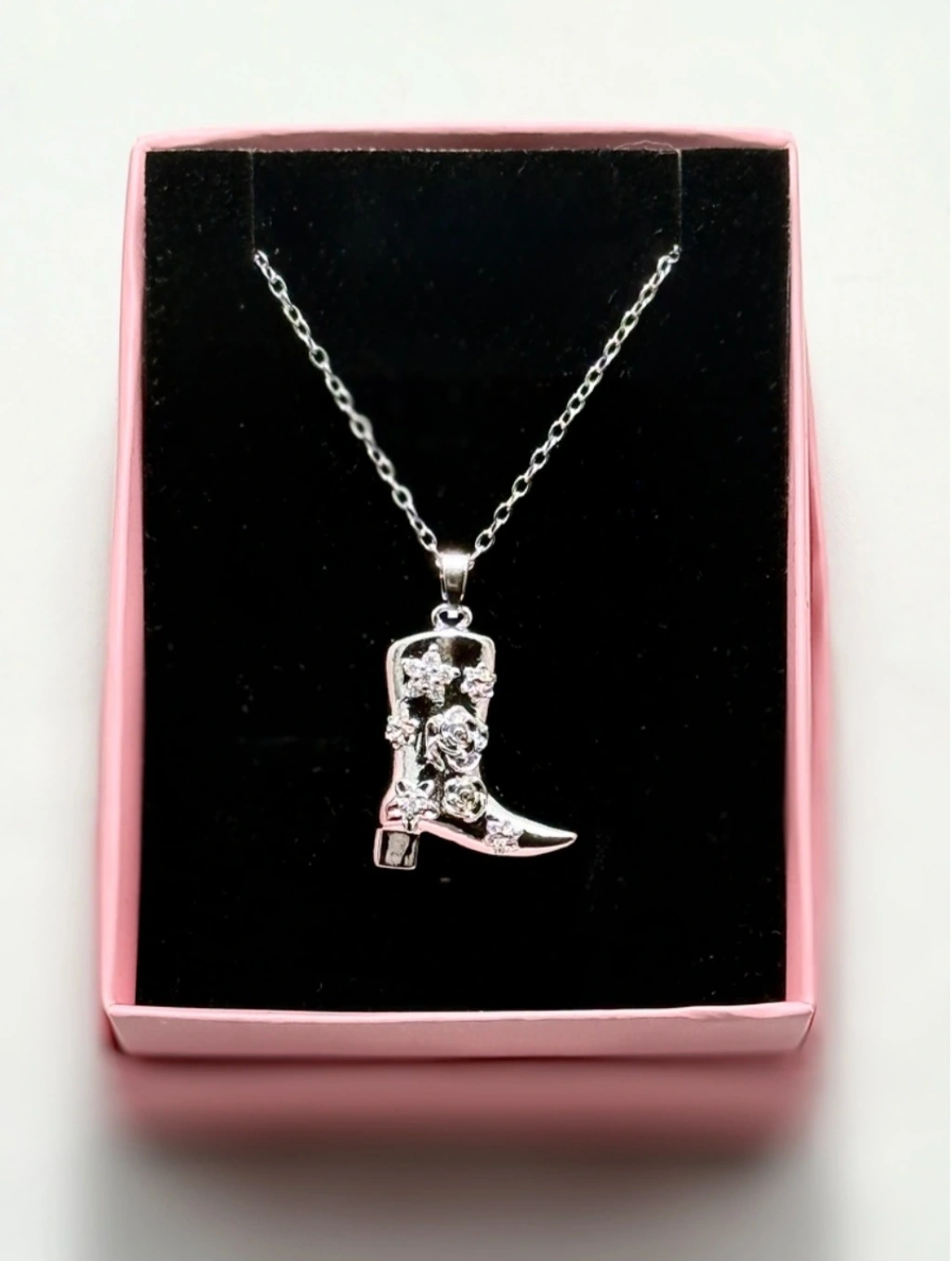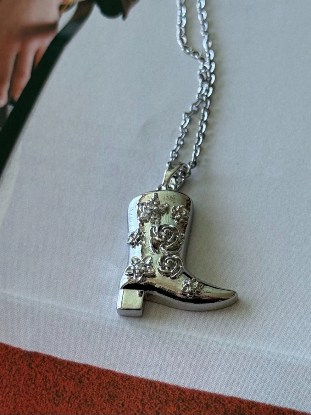 Western esintilerini modern bir şıklıkla buluşturan Gümüş Renkli Kovboy Çizme Detaylı Çelik Kolye, özgün tarzını ortaya koymak isteyenler için özel olarak tasarlandı. Parlak gümüş tonuyla dikkat çeken bu özel kolye, çizme formundaki zarif detayları ve üzerindeki çiçek işlemeleriyle hem feminen hem de iddialı bir duruş sergiler.