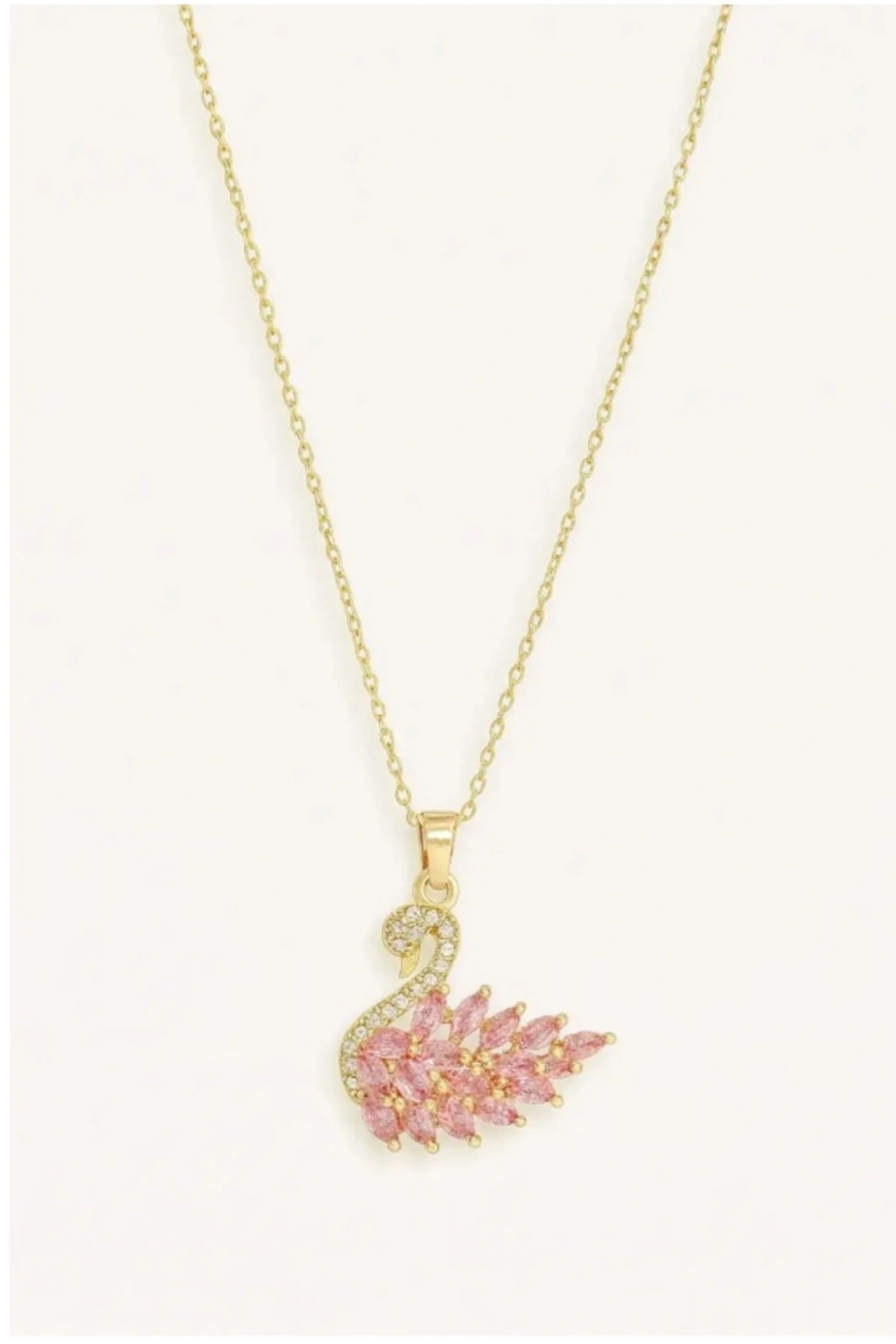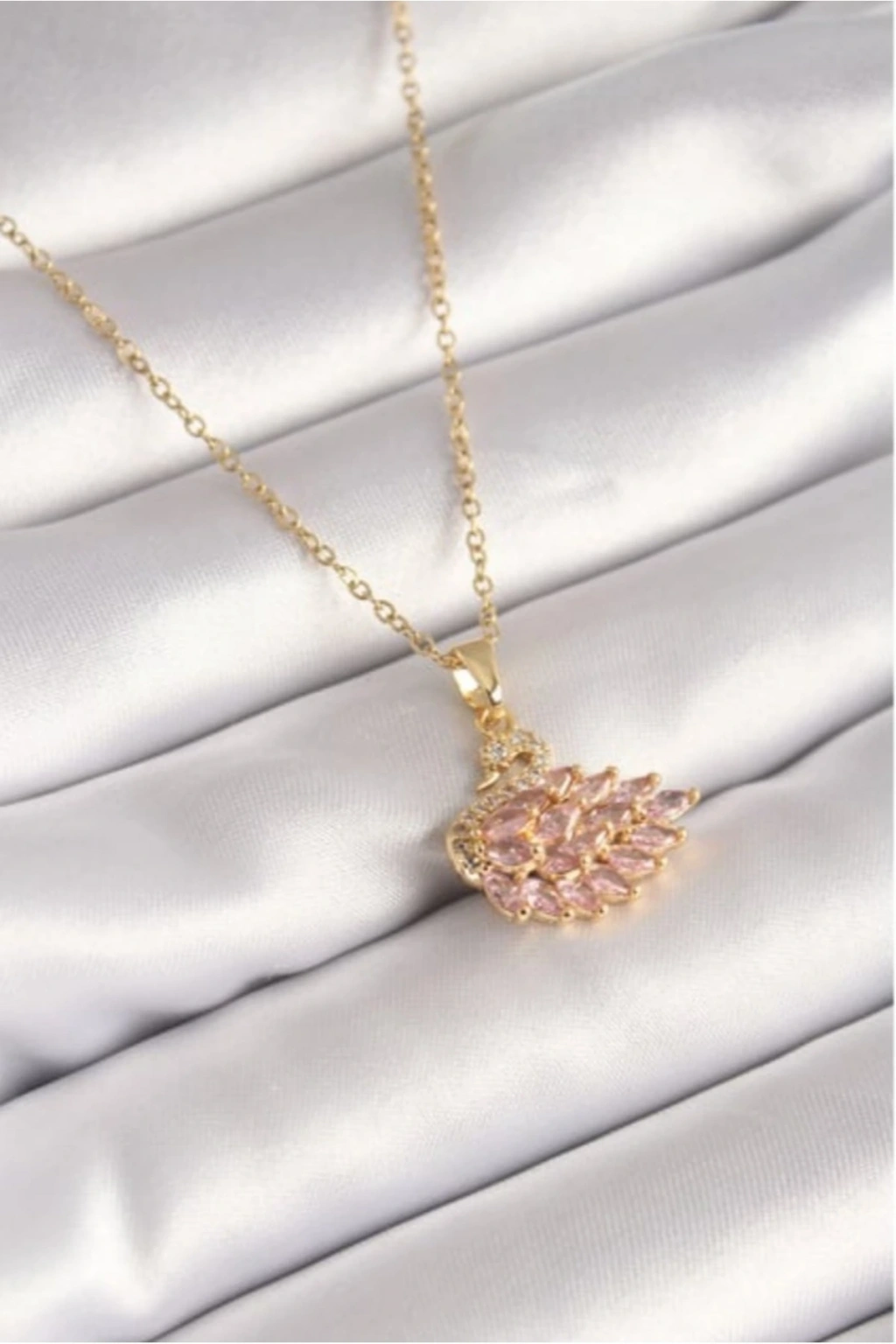 Kuğu Figürlü Çelik Gold Renkli Taşlı KolyeZarif tasarımıyla dikkat çeken bu kuğu figürlü çelik gold renkli kolye, şıklık ve anlamı bir arada sunuyor.; Kuğunun zarif gövdesi, parlak zirkon taşlarla işlenmiş detaylarla tamamlanırken, kuyruğunu süsleyen pembe tonlu yaprak kesim taşlar tasarıma romantik ve lüks bir hava katıyor.; Ürün Özellikleri:Malzeme: Paslanmaz çelik, gold kaplamaTaş Detayı: Parlak beyaz ve pembe zirkon taşlarFigür: Kuğu simgesi (zarafet, sadakat ve aşkın sembolü)Özellik: Kararma yapmaz, uzun ömürlü ve antialerjiktirKullanım Alanı: Günlük kullanım, özel davetler ve hediye seçeneğiNeden Tercih Etmelisiniz?Kuğu, zarafetin ve sadakatin sembolüdür.; Bu kolye, hem modern hem de romantik tasarımıyla kullanıcıya zarif bir stil sunarken, gold kaplama çelik yapısı sayesinde uzun yıllar ilk günkü ışıltısını korur.; Şık kutusunda gönderilerek hediye için de ideal bir seçenektir.; kuğu kolye, gold renkli çelik kolye, taşlı kolye, zarif takı, hediye için kolye, pembe taşlı kolye
