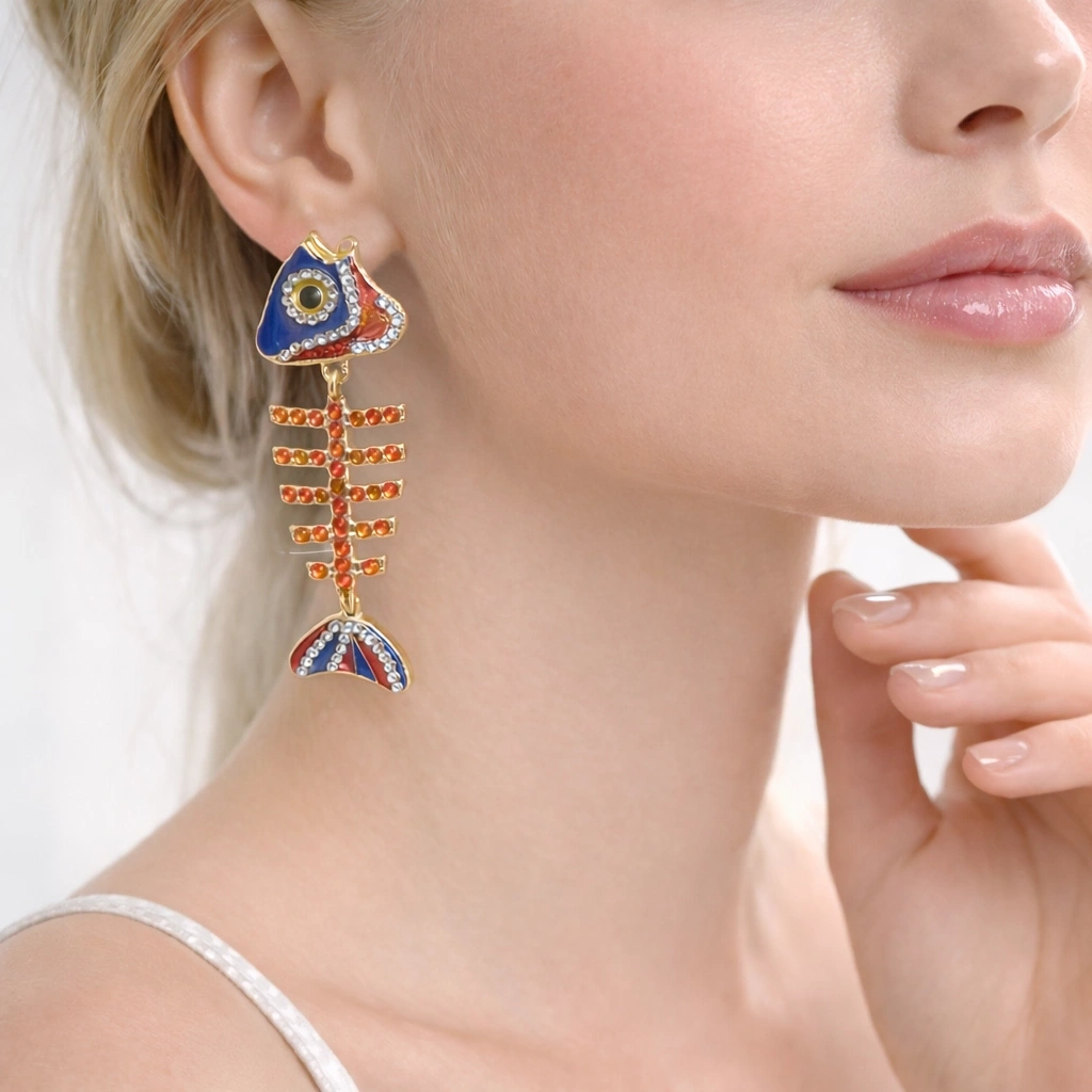 Canlı renkleri ve özgün tasarımıyla dikkat çeken bu marka model küpe, balık iskeleti figürünü modern ve eğlenceli bir stil anlayışıyla buluşturur. Lacivert, kırmızı ve turuncu tonlarının ışıltılı taş detaylarla harmanlandığı tasarımı sayesinde kombinlerinize enerjik ve çarpıcı bir dokunuş katar.