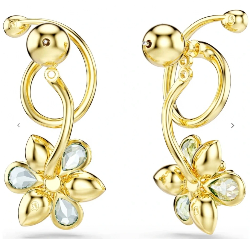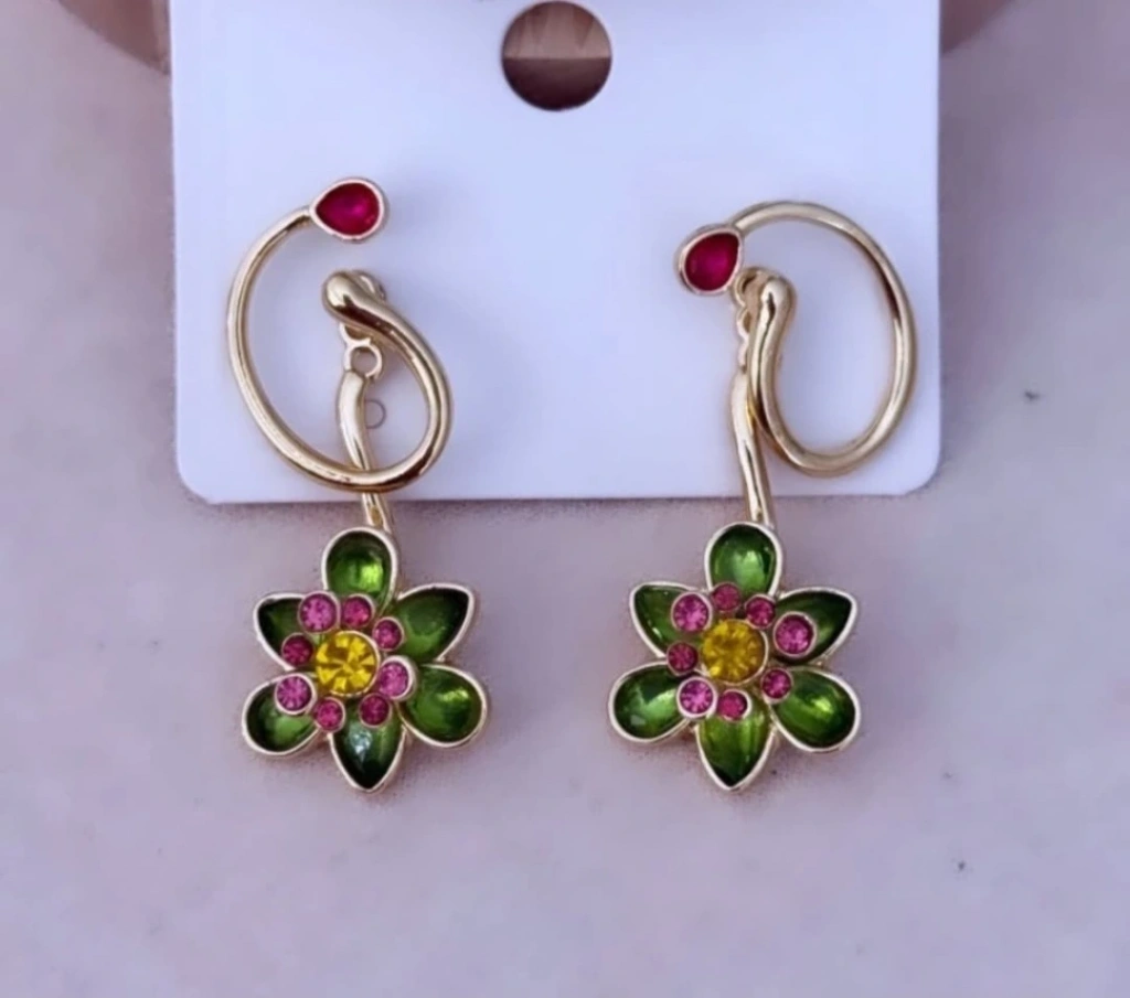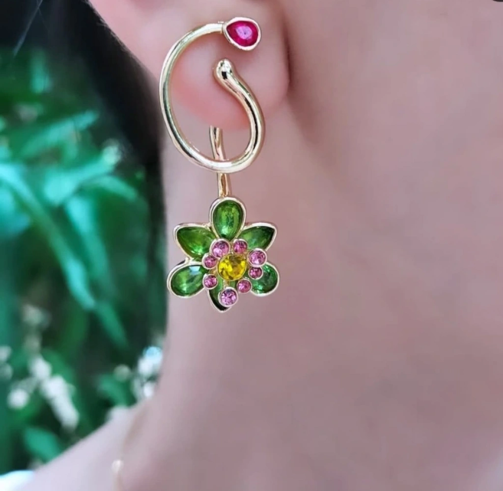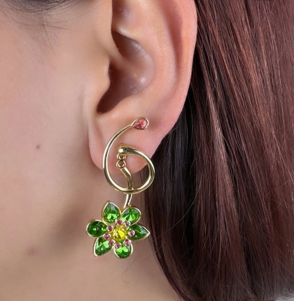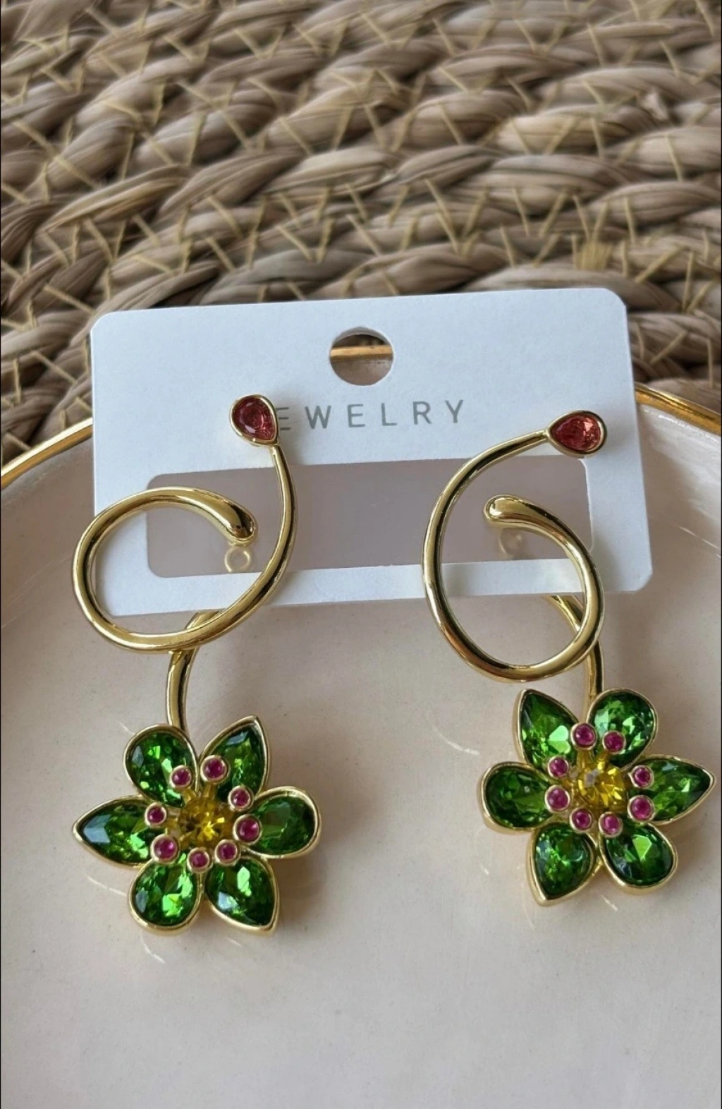 Zarif ve göz alıcı tasarımıyla dikkat çeken Swrvski taş detaylı gold çiçek küpe, ışıltılı yeşil ve pembe taşların uyumuyla şıklığı ön plana çıkarıyor. Gold kaplama detayı sayesinde hem klasik hem modern stillerle mükemmel bir uyum sağlar. Günlük kombinlerden özel davetlere kadar her anınıza zarafet katar.
