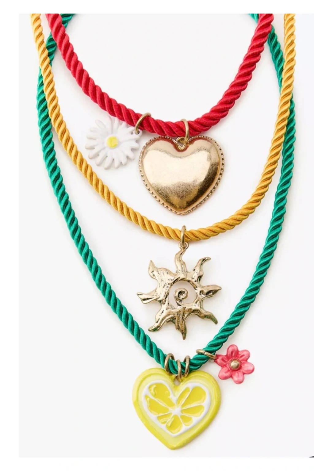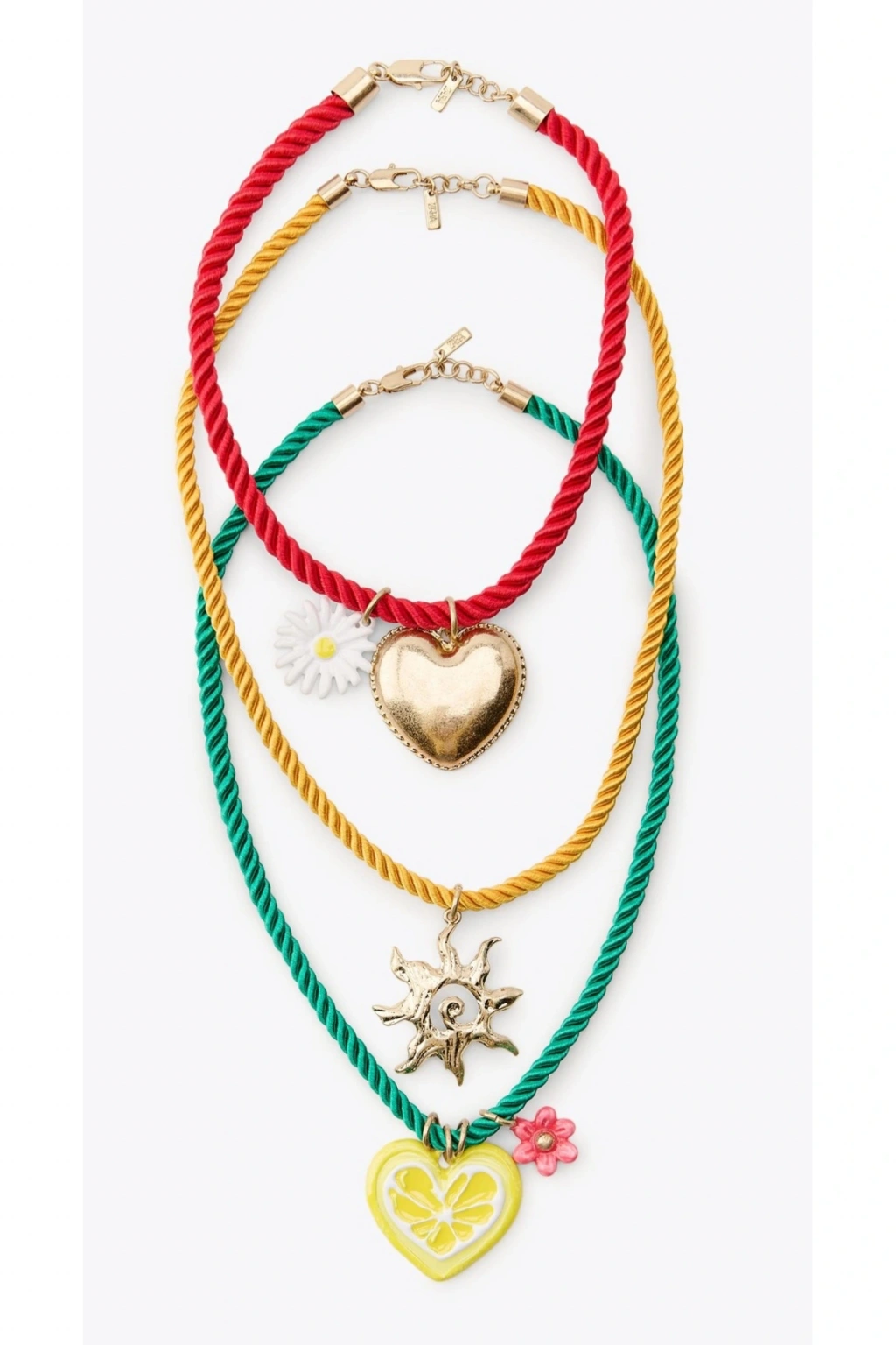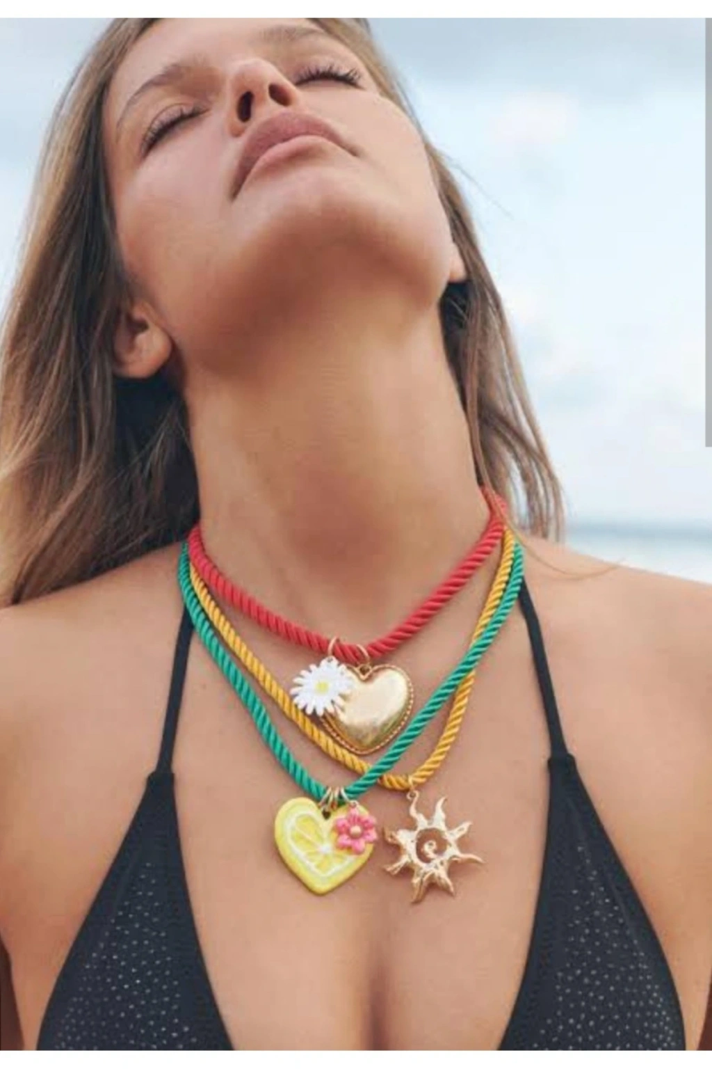 VIP Serisi Kalpli 3’lü Set Kolye Yaza enerji katan ve stilinizi renklendiren VIP Serisi Kalpli 3’lü Set Kolye ile kombinlerinize canlılık katın! Kalın renkli halat ipleri ve özel tasarım charm detaylarıyla hazırlanan bu set, her biri farklı anlam ve şıklık taşıyan üç ayrı kolyeden oluşur.; Gold Kalp ve Papatya Charm’lı Kırmızı Halat Kolye Limon Dilimi ve Çiçek Figürlü Yeşil Halat Kolye Gold Güneş Charm Detaylı Sarı Halat Kolye Her biri ayrı ayrı ya da birlikte kullanılabilir.; suya ve kimyasala dayanıklı yapısıyla günlük kullanıma uygundur.; Renkli ve enerjik tasarımı sayesinde festival, plaj ve yaz kombinlerinizin favorisi olacak.; Naaksesuar kalitesi ve farkıyla sınırlı sayıda VIP seri! Şimdi sepetine ekle, yazın enerjisini stilinle taşı!