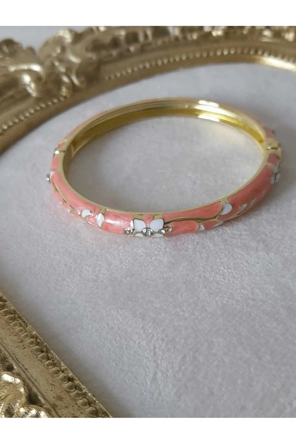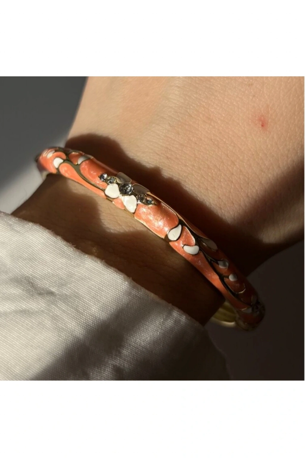 Mineli detaylarla zenginleştirilmiş, ince işçiliğe sahip bu zarif kelepçe bileklik; gold renk iç yüzeyiyle lüks bir duruş sergiler.; Modern tasarımı ve şık taş süslemeleri sayesinde hem günlük hem özel gün kombinlerinize kolayca uyum sağlar.; Hafif yapısıyla bilekte konforlu bir kullanım sunarken, trend görünümüyle stilinize ışıltı katar.; CEO uyumlu, vitrinlerin göz alıcı parçalarından biridir.; Somon rengi