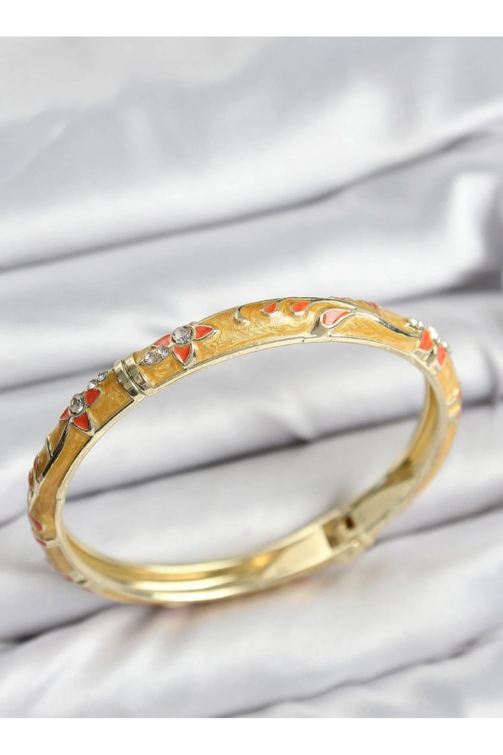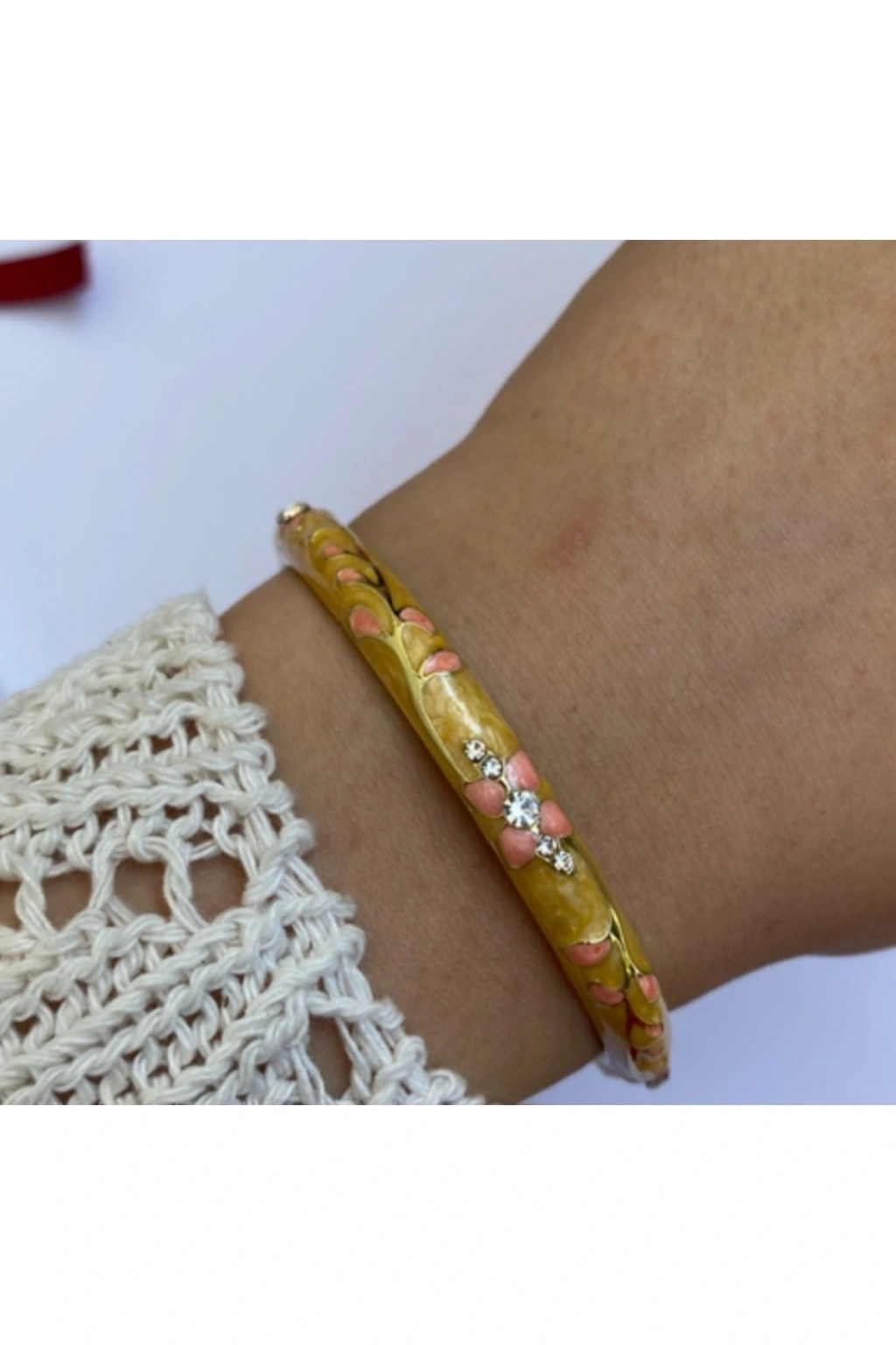 Mineli Taşlı Çiçek Detaylı Sarı Kelepçe BileklikŞıklığı ve zarafeti bir arada sunan mineli taşlı çiçek detaylı sarı kelepçe bileklik, feminen çizgileri ve göz alıcı tasarımıyla stilinize modern bir dokunuş katar.; Sarı mine üzerine işlenmiş çiçek motifleri, parlak taş süslemeleriyle bütünleşerek bileğinizde ışıltılı ve zarif bir görünüm oluşturur.; Öne Çıkan Özellikler:Premium kalite malzeme ve parlak altın kaplamaÇiçek desenli mine işçiliğiyle estetik tasarımParlak taş detaylarıyla lüks ve zarif görünümKararma yapmaz, uzun ömürlü ve antialerjik kullanımGünlük kombinlerden özel davetlere kadar çok yönlü uyumKlasik ve modern çizgilerin buluştuğu bu özel tasarım, kendinize ya da sevdiklerinize şık bir hediye seçeneğidir.; Bileğinizde zarafeti ve ışıltıyı bir araya getiren bu kelepçe, koleksiyonunuzun en özel parçalarından biri olacak.; ✨ Naaksesuar Luxury Serisi – Çiçek desenleriyle şıklığın en zarif hali.