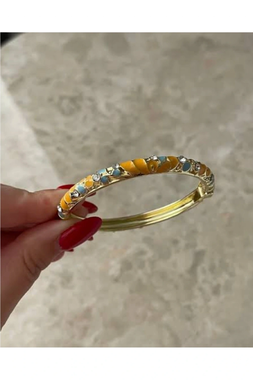 Mineli Taşlı Desenli Kelepçe BileklikZarafeti ve modern şıklığı bir araya getiren mineli taşlı desenli kelepçe bileklik, özgün tasarımı ve parlak detaylarıyla öne çıkıyor.; Canlı mine renklerinin göz alıcı ışıltısı, taş işlemeleriyle birleşerek bileğinizde benzersiz bir duruş sergiler.; Öne Çıkan Özellikler:Premium kalite malzeme ve parlak kaplamaCanlı mine detayları ile dikkat çekici tasarımTaş süslemelerle ışıltılı ve lüks bir görünümKararma yapmaz, uzun ömürlü ve antialerjik kullanımGünlük kombinlerden özel davetlere kadar çok yönlü uyumHer detayında zarafet ve estetik barındıran bu kelepçe, hediye seçeneği olarak da mükemmel bir tercihtir.; Şıklığınıza modern ve lüks bir dokunuş katmak isteyenler için özel olarak tasarlanmıştır.; ✨ Naaksesuar Luxury Serisi – Tarzınızı her ortamda ön plana çıkarın.