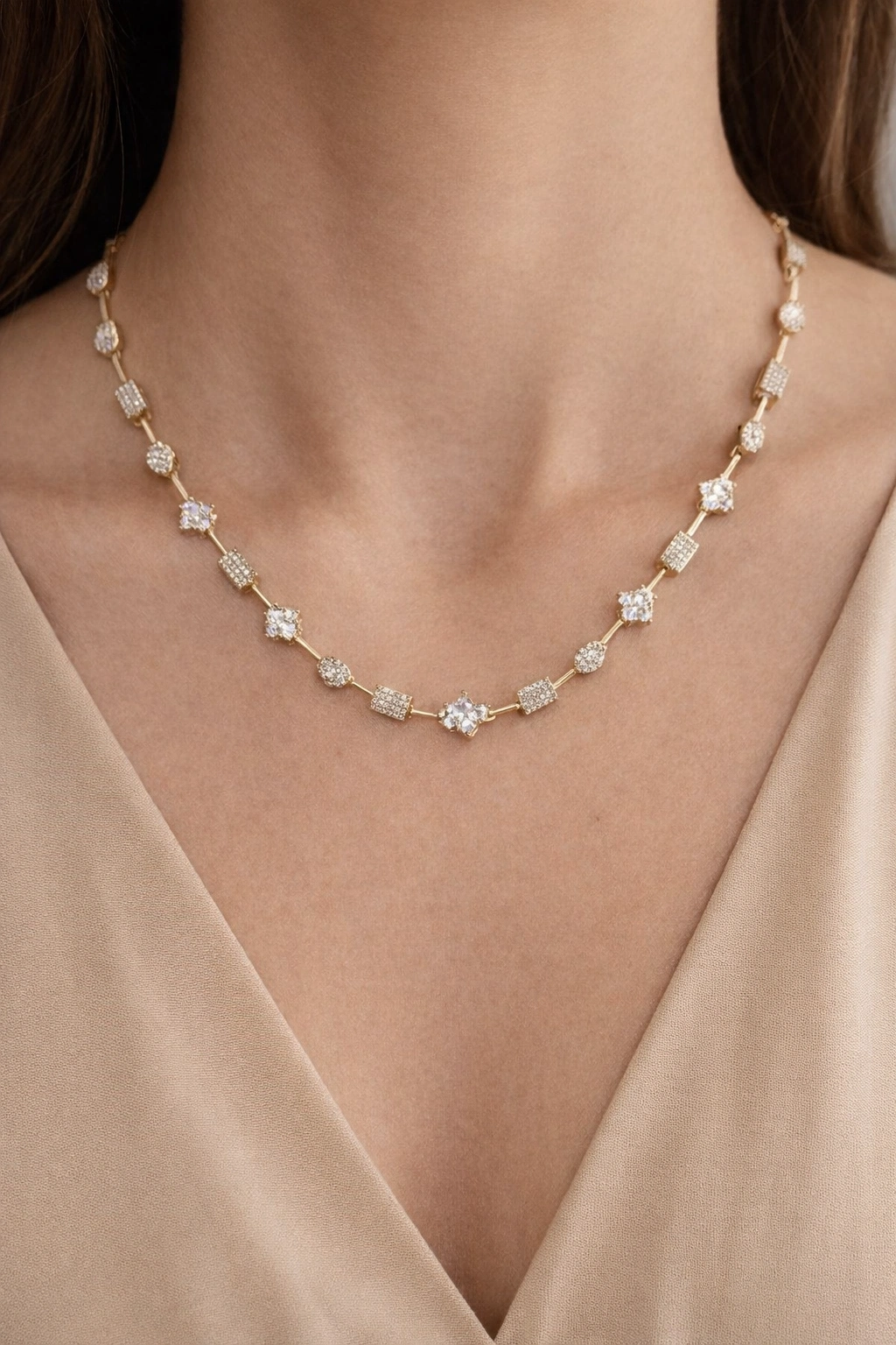 Minimal çizgilerle zenginleştirilmiş taş detayları, boynunuzda zarif bir ışıltı oluşturur. Hem tek başına güçlü bir stil parçası hem de kombinlerin tamamlayıcısıdır.