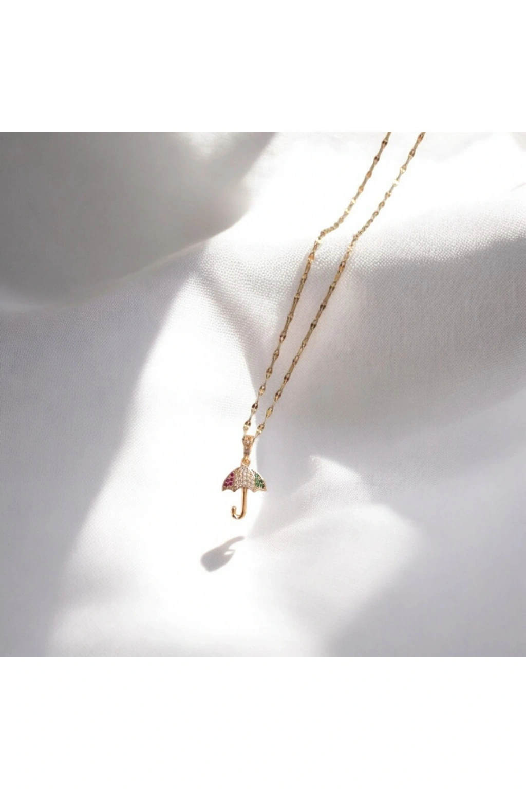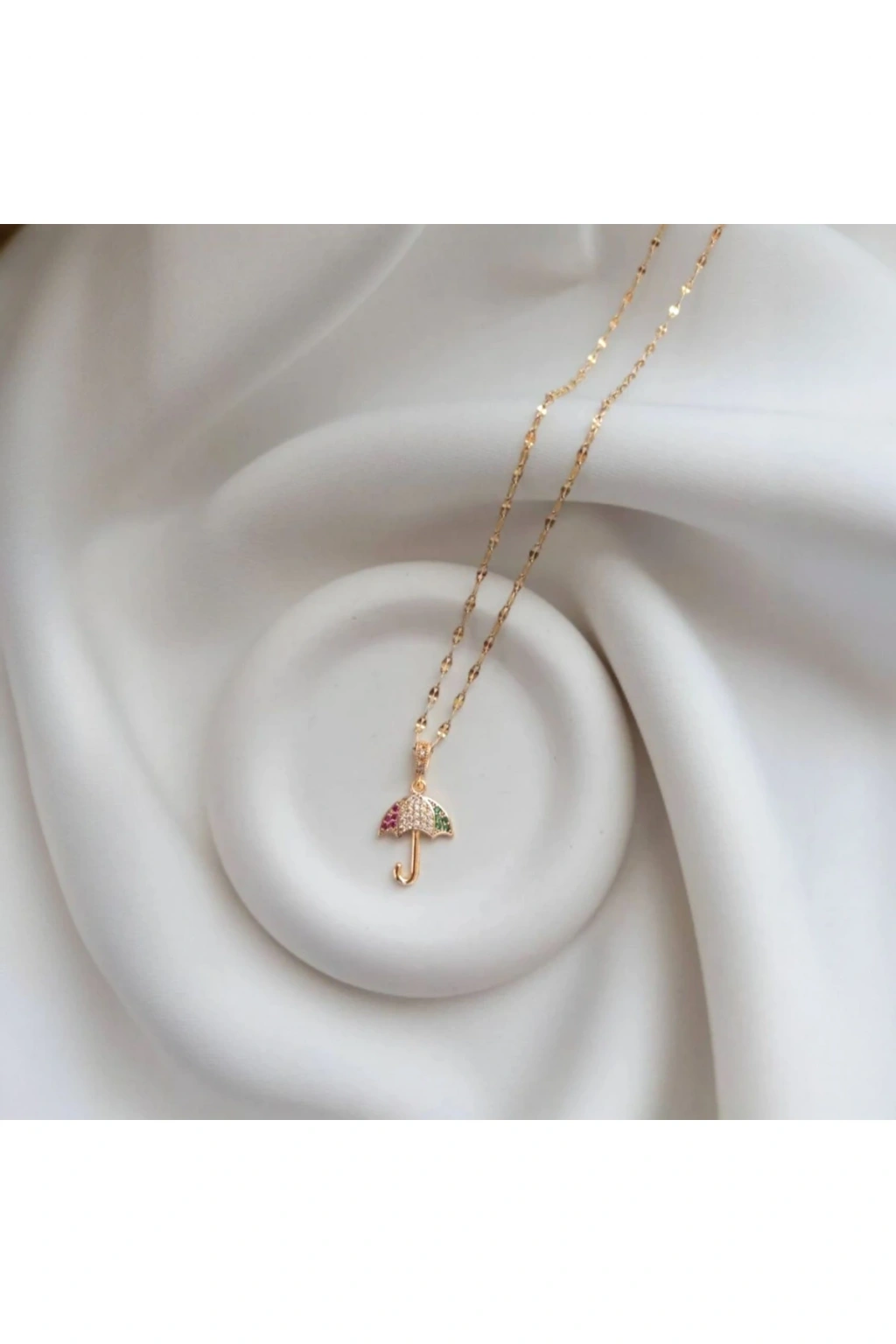 Zarafetinizi Yağmura Karşı Taçlandırın! Minimal ve şık tasarımıyla öne çıkan şemsiye figürlü zirkon taşlı gold çelik kolye, stilinize sofistike bir dokunuş katıyor.; Dayanıklı paslanmaz çelik üzerine işlenen ışıltılı zirkon taş detayları, zarafetinizi her an yansıtmanızı sağlarken, altın renginin sıcak tonu ile kombinlerinize şıklık katıyor.; Günlük ve özel gün kullanımlarında ideal olan bu kolye, CEO stiline uyumlu zarif bir tamamlayıcıdır.; ✨ Paslanmaz çelik – Kararmaz & suya dayanıklı ✨ Zirkon taş detaylarıyla ışıltılı görünüm ✨ Minimal ve zarif tasarım