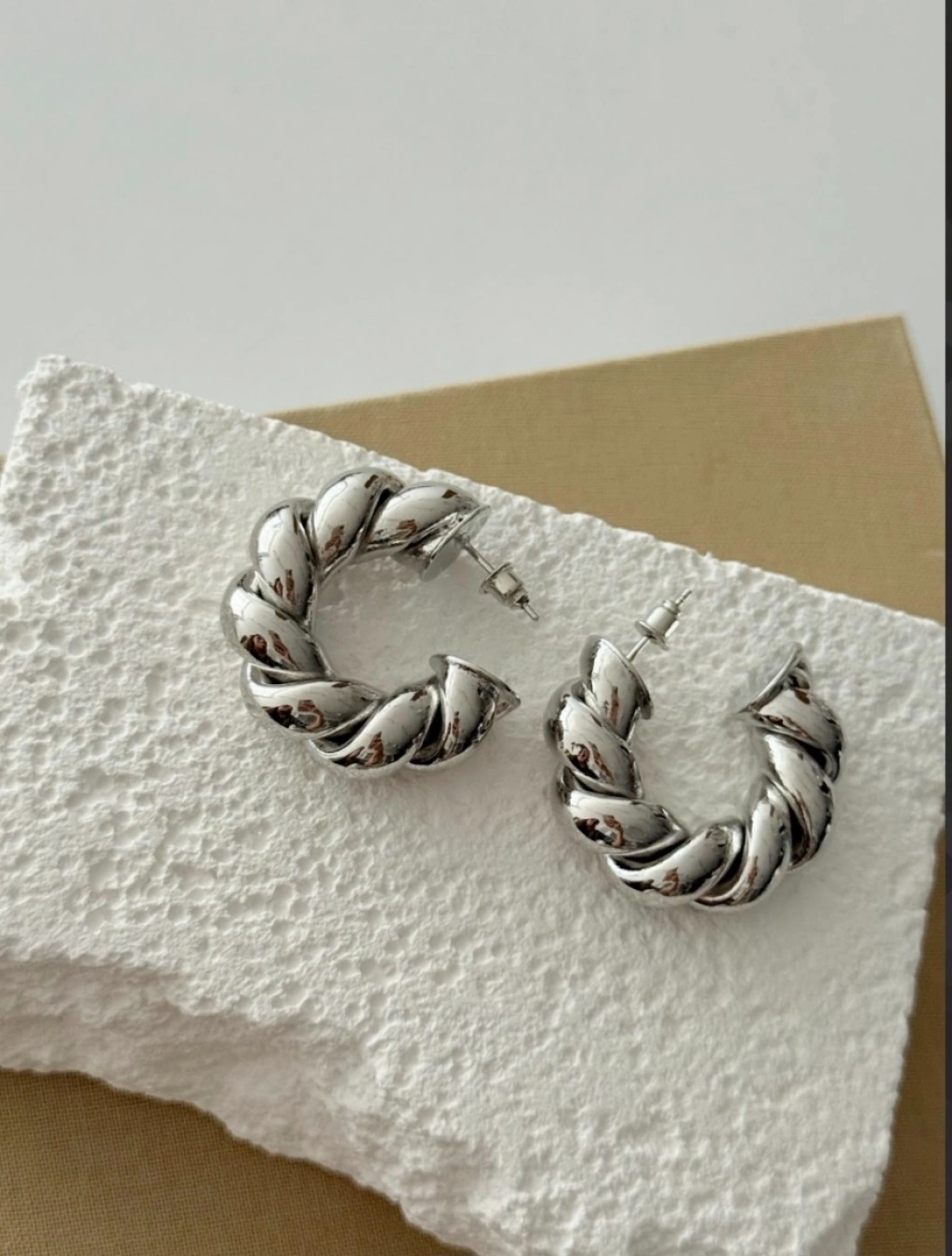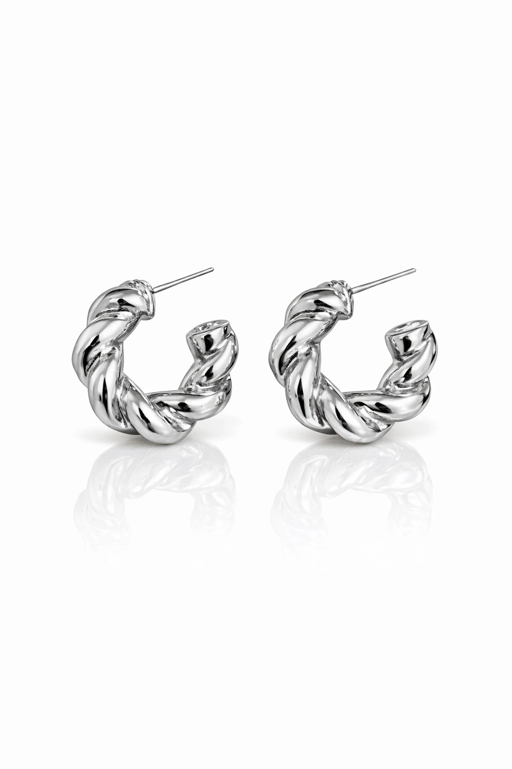 Klasik burgu formundan ilham alan bu gümüş renkli halka küpe, vintage estetiği modern çizgilerle bir araya getirerek zamansız bir şıklık sunar. Işığı zarif şekilde yansıtan dokulu yüzeyi sayesinde güçlü, sofistike ve dikkat çekici bir görünüm oluşturur.