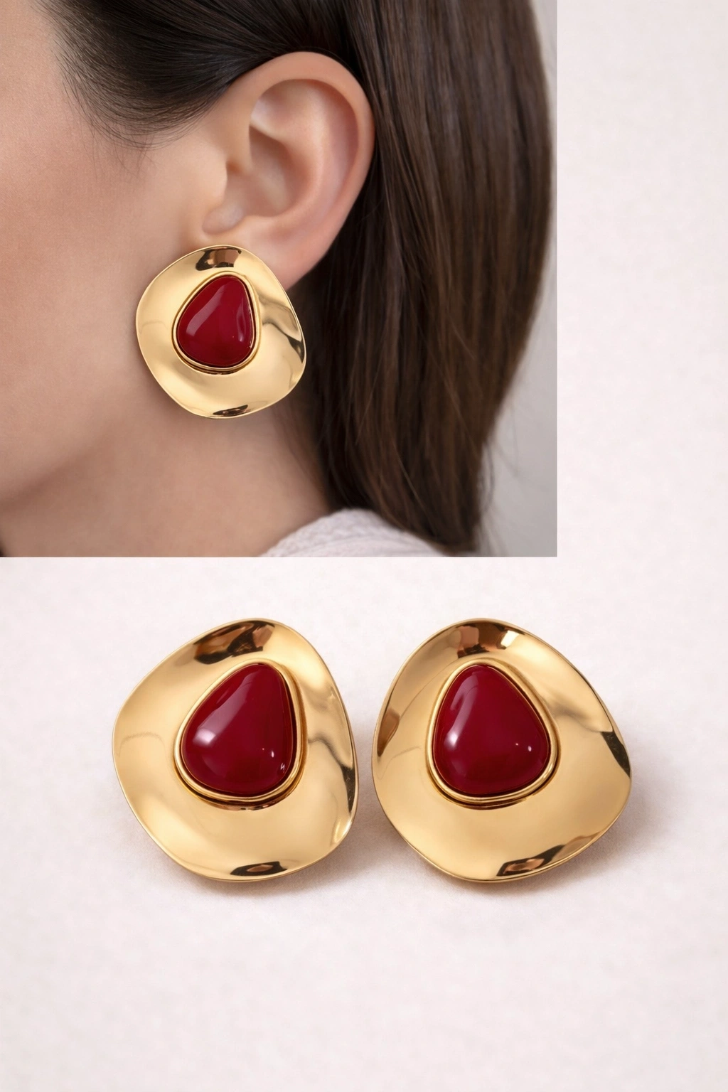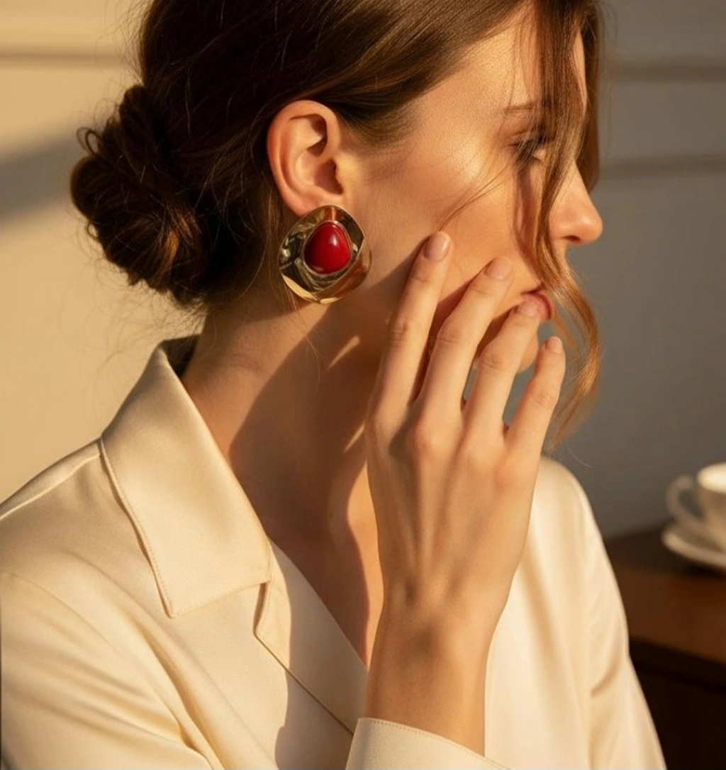 Sade bir elbise veya beyaz gömlek ile kombinleyerek küpenin kırmızı taş detayını ön plana çıkarabilirsiniz. Topuz veya geriye taranmış saç modelleri ile maksimum etki sağlar.