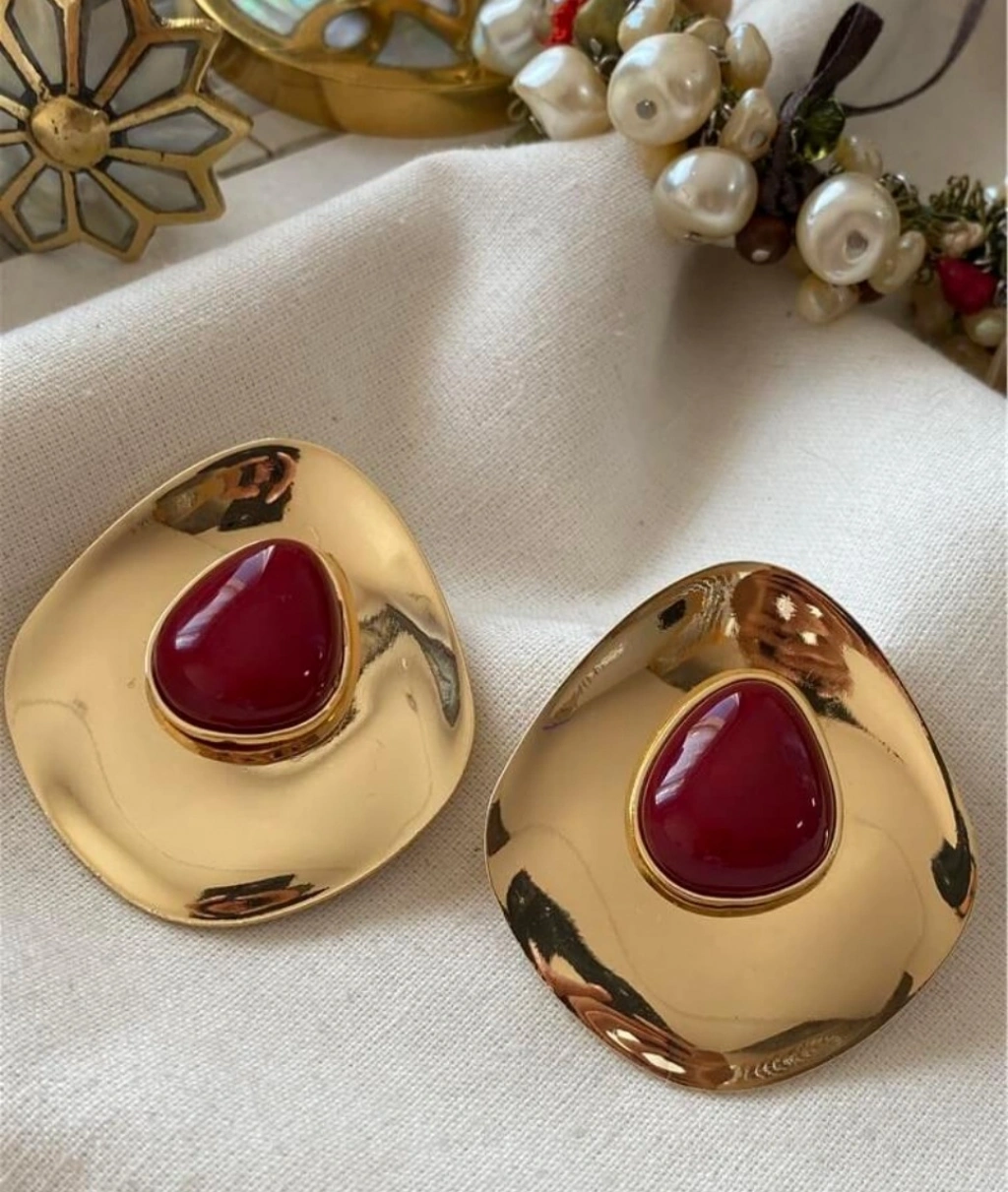 gold küpe, kırmızı taşlı küpe, vintage küpe, büyük küpe, kadın küpe modelleri, şık küpe, statement küpe, gold taşlı küpe, Naaksesuar küpe